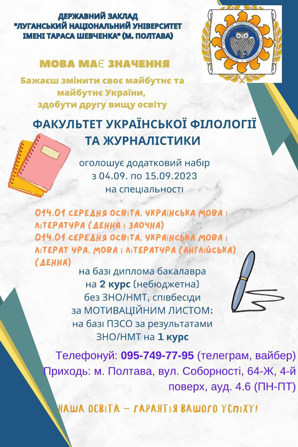 Запрошуємо на другий курс тих, хто бажає здобути ще одну вищу освіту на основі диплома бакалавра за спеціальністю 014.01 СЕРЕДНЯ ОСВІТА. УКРАЇНСЬКА МОВА І ЛІТЕРАУРА: