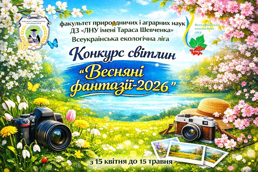 Факультет природничих і аграрних наук ДЗ "Луганський національний університет імені Тараса Шевченка" спільно з ГО «Всеукраїнська екологічна ліга» запрошують учнів, студентів, викладачів та всіх охочих долучитися до традиційного щорічного фотоконкурсу "Весняні фантазії - 2026"!