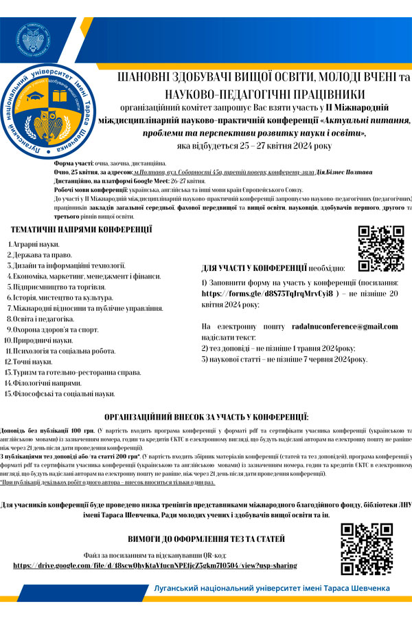 До участі у ІІ Міжнародній міждисциплінарній науково-практичній конференції запрошуємо науково-педагогічних (педагогічних) працівників закладів загальної середньої, фахової передвищої та вищої освіти, науковців, здобувачів першого, другого та третього рівнів вищої освіти, докторантів.