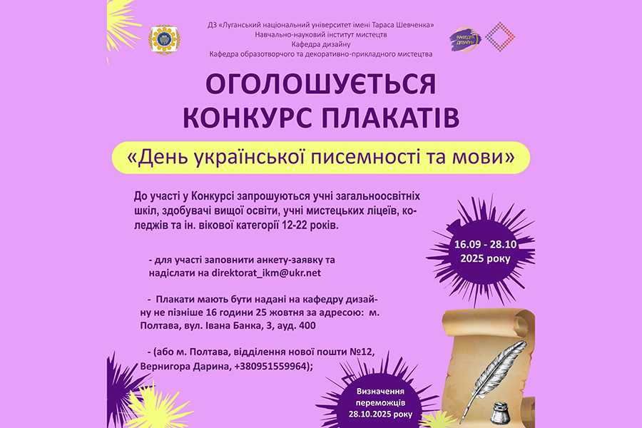 Вік учасників: 12-22 роківОрганізатор Конкурсу: ДЗ «Луганській національний університет імені Тараса Шевченка». Навчально-науковий інститут мистецтв, кафедра дизайну, кафедра образотворчого та декоративно-прикладного мистецтва.
