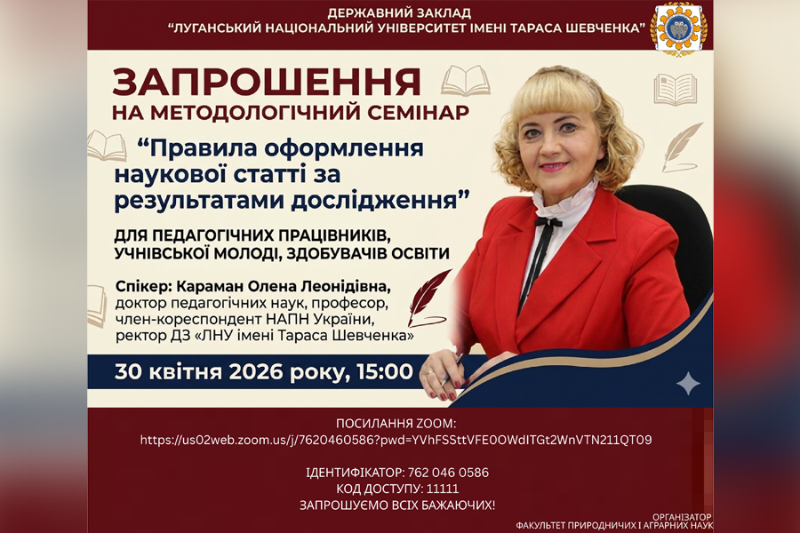 30.04.2026 року о 15.00 відбудеться методологічний семінар для педагогічних працівників, учнівської молоді, здобувачів освіти на тему: «Правила оформлення наукової статті за результатами дослідження». Спікер: Караман О. Л., доктор педагогічних наук, професор, член-кореспондент НАПН України, ректор ДЗ «ЛНУ імені Тараса Шевченка».