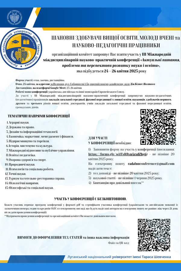 До участі у ІIІ Міжнародній міждисциплінарній науково-практичній конференції запрошуємо науково-педагогічних (педагогічних) працівників закладів загальної середньої, фахової передвищої та вищої освіти, науковців, здобувачів першого, другого та третього рівнів вищої освіти, докторантів, учнів закладів загальної середньої та фахової передвищої освіти, громадських діячів.