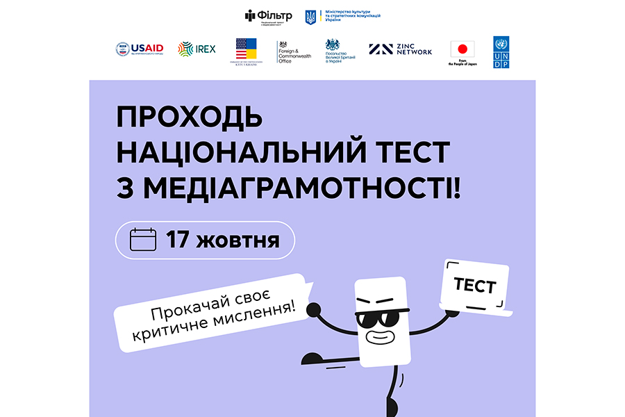 The National Media Literacy Test is implemented by the National Media Literacy Project "Filter" of the Ministry of Culture and Strategic Communications with the support of UNDP in Ukraine and funding from the Government of Japan, and the Media Literacy and Cognitive Resilience Project in Ukraine, implemented by Zinc Network and funded by the Government of Great Britain. The National Media Literacy Test is implemented together with the USAID "Dream and Act" program, which is implemented by IREX in Ukraine, and the "Study and Discern: Infomedia Literacy in Education" project, which is implemented by IREX Ukraine with the support of the US Embassy.