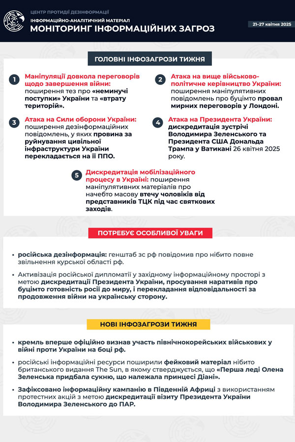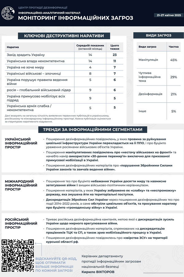 The information and analytical material highlights key narratives, fakes, manipulations and information operations that are actively promoted by the enemy in order to destabilize the situation in Ukraine, reduce the moral and psychological state of citizens, discredit state institutions and undermine trust in the Armed Forces of Ukraine and international support.