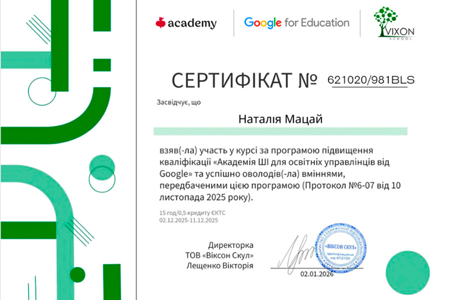 Iryna SOKOL - computer science teacher of the Sichov Collegium Secondary Educational Service, member of the MES working group on the implementation of AI in secondary education institutions, certified Google for Education trainer; Anastasia SHUPLAT - lecturer at the Department of Pedagogy and Innovative Education of Lviv Polytechnic, Senior Training Program Manager at Beetroot Academy, certified Google for Education educator; Antonina BUKACH - director of the Academy of Digital Development, certified Google for Education trainer; Vasyl ORISHCHUK – Deputy Chairman, Chairman of the Committee on Professional, Specialized Pre-Higher Education, Science and Innovation of the Public Council under the Ministry of Education of Ukraine, co-author of the framework recommendations “Advice on the Responsible Use of AI by Public Servants”, certified Google for Education educator.