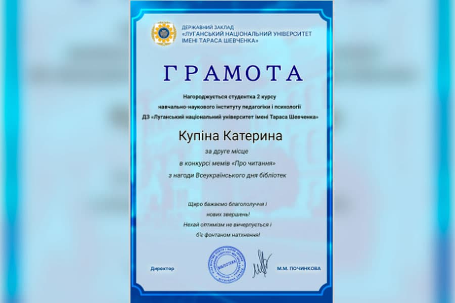 We sincerely congratulate Kateryna Kupina, a 2nd year student of the second (master's) level of education majoring in "Social Work. Social Pedagogy. Practical Psychology", on winning 2nd place in the meme competition dedicated to the All-Ukrainian Library Day!