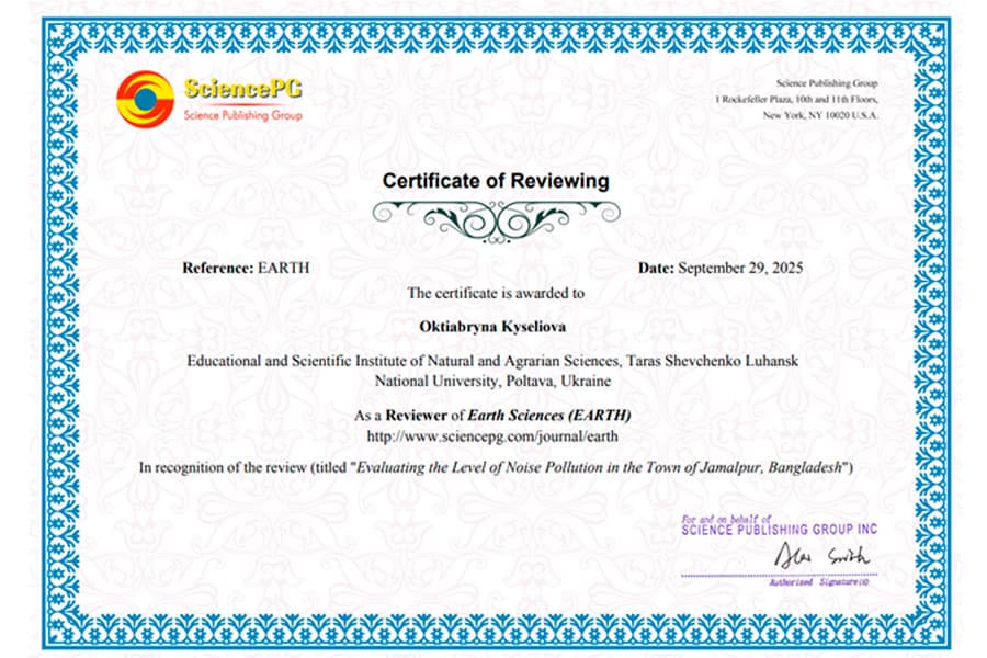 On September 29, Oktiabryna Oleksandrivna Kyselova, Candidate of Geographical Sciences, Associate Professor of the Department of Chemistry, Geography and Earth Sciences, Honorary Professor of LTSNU, received an international certificate for performing the duties of a reviewer in the prestigious scientific journal Earth Sciences (Science Publishing Group, New York, USA).