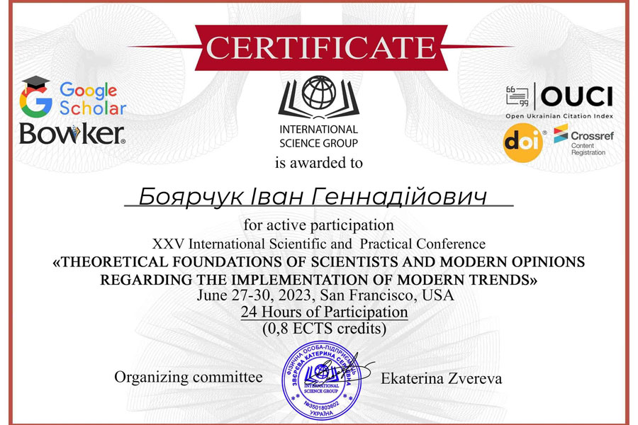 In March 2023, Ivan Boiarchuk successfully completed the e-learning course "Basic Security Rules in the Digital Environment" within the framework of cooperation between Luhansk Taras Shevchenko National University and the Civil Research and Development Foundation of the United States within the framework of grant agreement G-202301-69860 and received a certificate.