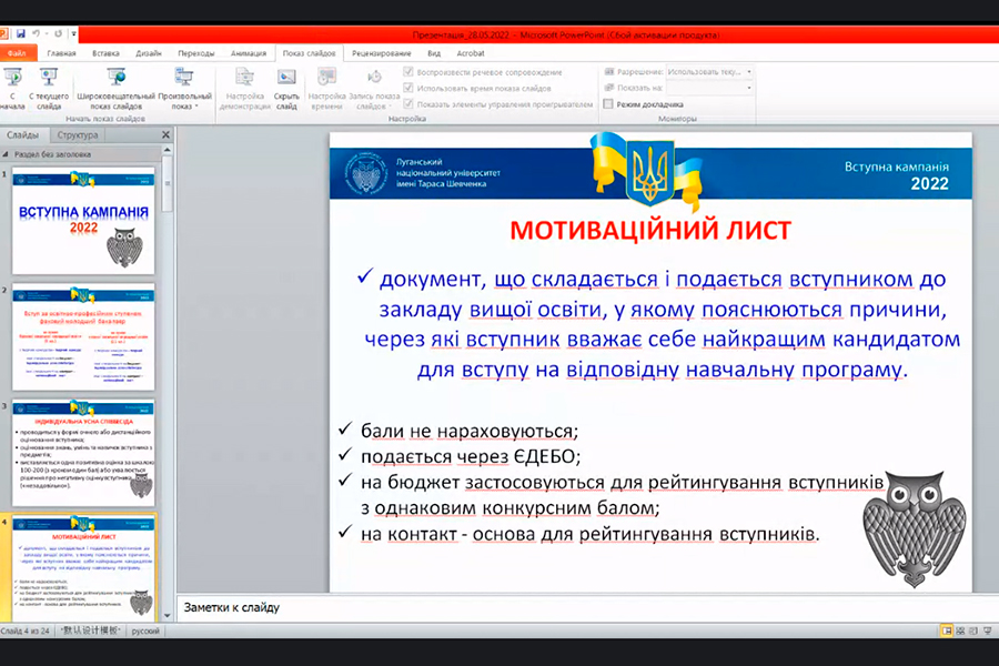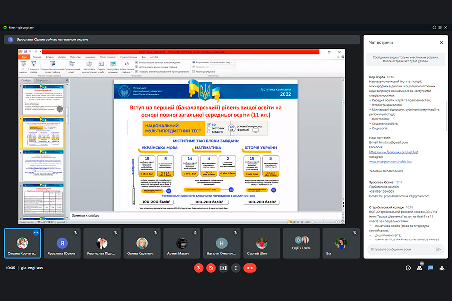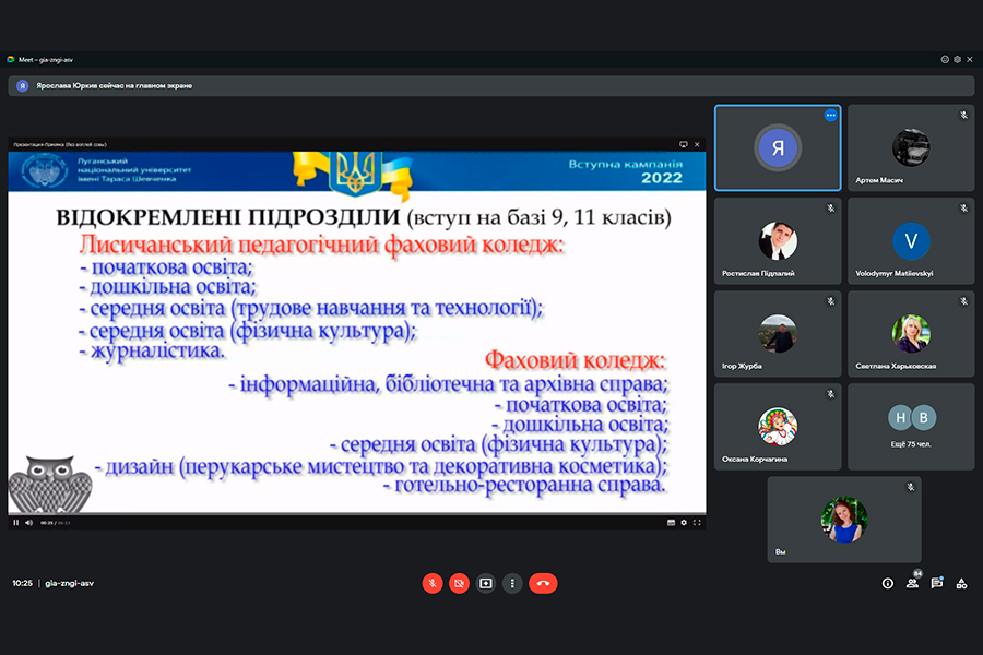 Traditionally, the event was held on the online platform Google Meet and duplicated on the official Instagram page of the university. The Rector Olena Karaman, Vice-Rector for Scientific and Pedagogical Work Yaroslava Yurkiv, Executive Secretary of the Admissions Committee Oksana Korchagina, directors of educational and research institutes, deans of faculties, deputies, heads and representatives of departments of structural subdivisions of LTSNU represented the university today.