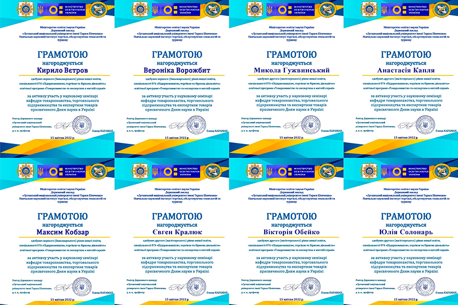 According to the results of presentations of scientific reports, all participants were awarded diplomas for active participation in the presentation and discussion of scientific research, promotion of commodity science, expert and evaluation activities.