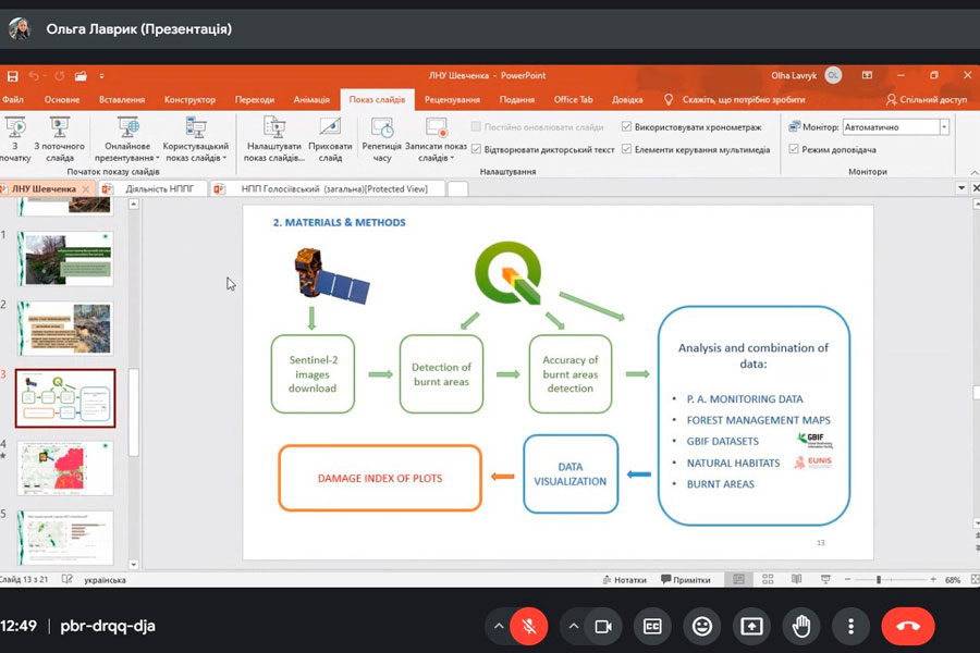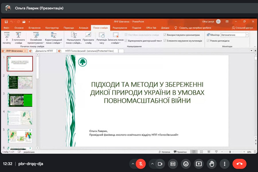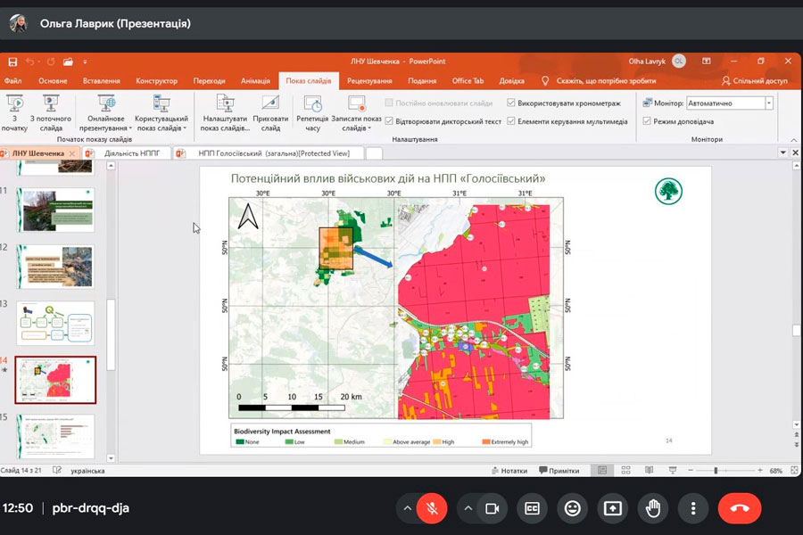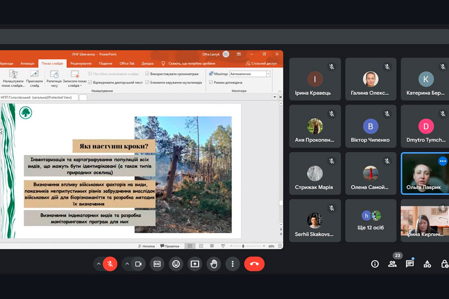 Mrs. Olha talked about what methods are used to study the state of the environment and what environmental damage is caused to nature. Therefore, during the meeting, important issues were considered - what should be the next steps for nature conservation in Ukraine: inventory and mapping of populations of all species that can be identified (as well as types of habitats); determining the impact of military factors on species; determination of indicators of unacceptable levels of pollution due to military actions for biodiversity and development of methods for their determination; identification of indicator species and development of monitoring programs for them; counts of the number of all rare species; mapping invasive species and monitoring their spread; monitoring of successional changes, determination of the volume of ecosystem services not received by Ukrainian citizens as a result of military digression.