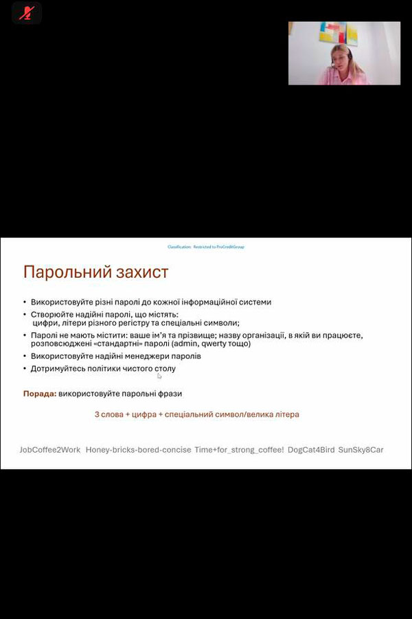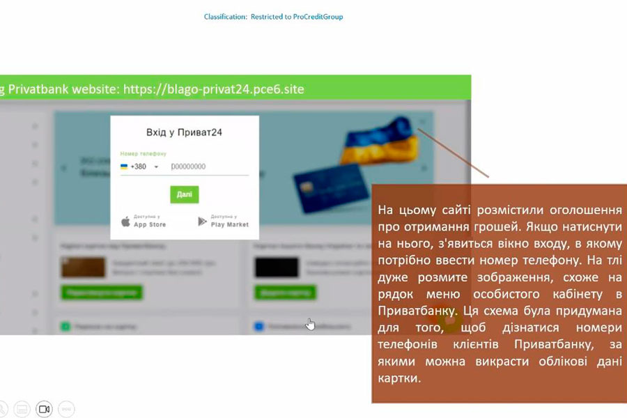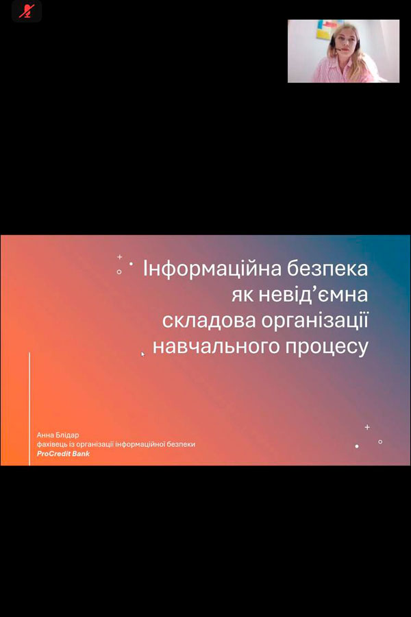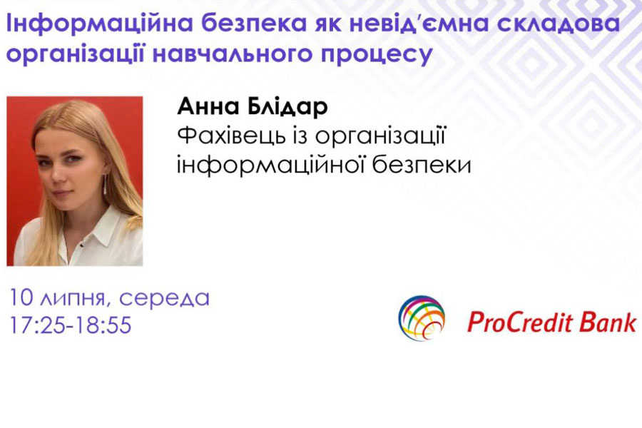 Ana Blidar, an information security organization specialist at ProCredit Bank, held a webinar on the topic: "Information Security as an Integral Part of the Educational Process." Ms. Ana shared her experience in information verification, provided several real cases of information fraud and ways to ensure protection for her personal information and during the educational process in educational institutions.