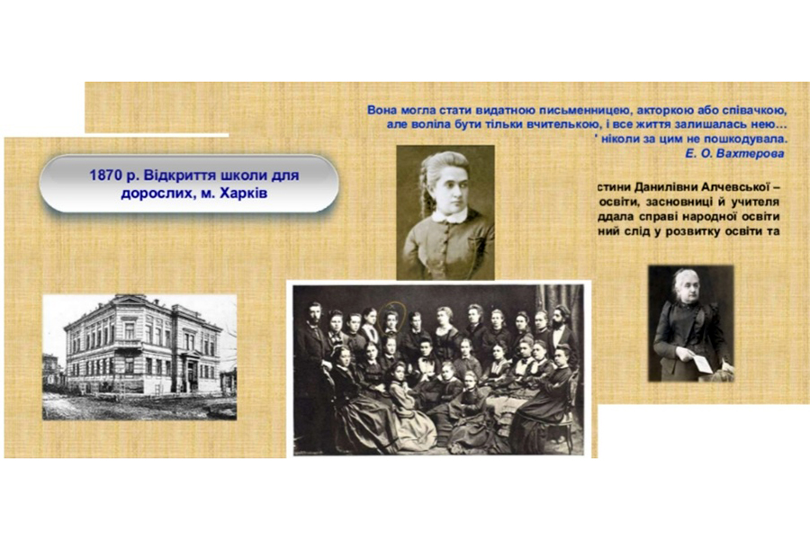 Such a figure for us is Khrystyna Danylivna Alchevska - Ukrainian teacher, progressive public educator, founder and teacher of Kharkiv Private Women's Sunday School and Public School in the village Oleksiyivka in the Yekaterinoslav district (now the Perevalskyi district of the Luhansk region), where another famous Ukrainian pedagogue and writer B.D. Hrinchenko taught. She devoted almost six decades of her life to public education and left a significant contribution to the development of education and culture in Ukraine. Alchevska combined the rare gift of a theorist, experimenter, talented teacher and considered public education one of the main factors in the cultural and spiritual revival of the native land and the development of society.