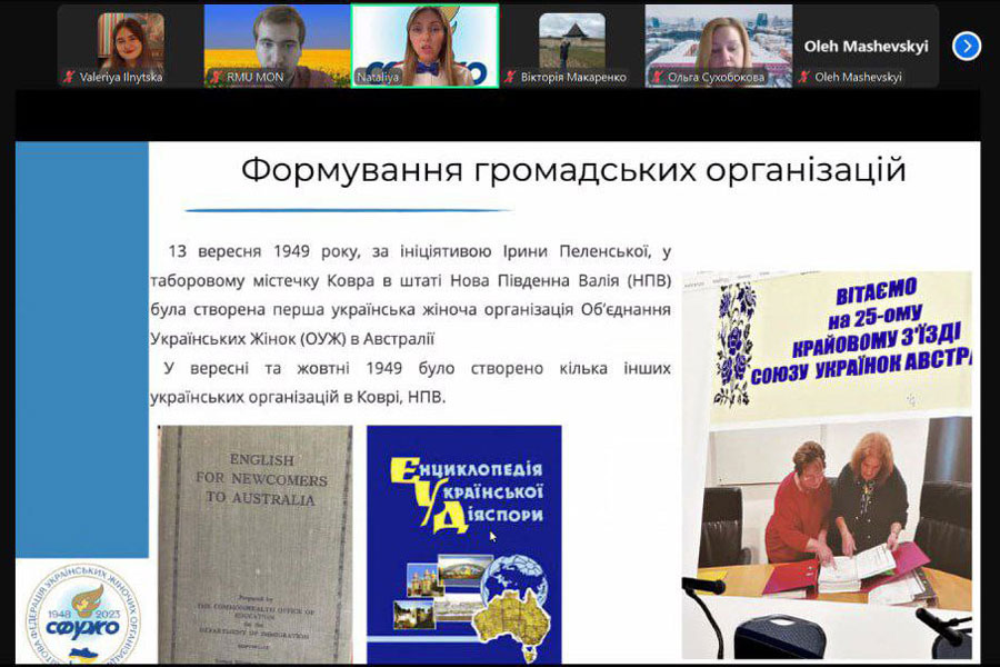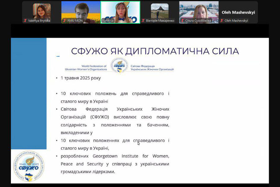 Students of the Educational and Research Institute of Social and Humanitarian Sciences, in particular Viktoriia Makarenko and Valeriia Ilnytska, attended an informative lecture dedicated to the World Federation of Ukrainian Women's Organizations (WFOU) - a structure that has united Ukrainian women from 16 countries of the world for over 75 years.