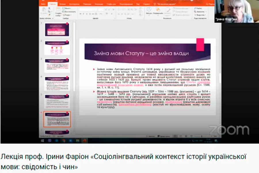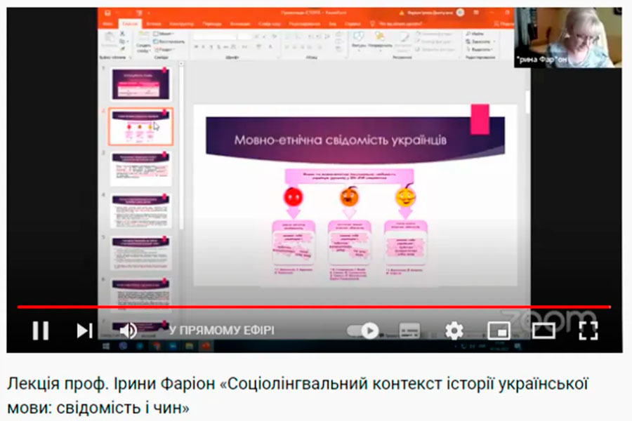 The meeting with Iryna Farion, Doctor of Philology, Professor of Lviv Polytechnic National University, took place live online on the Zoom platform via Youtube and Facebook.