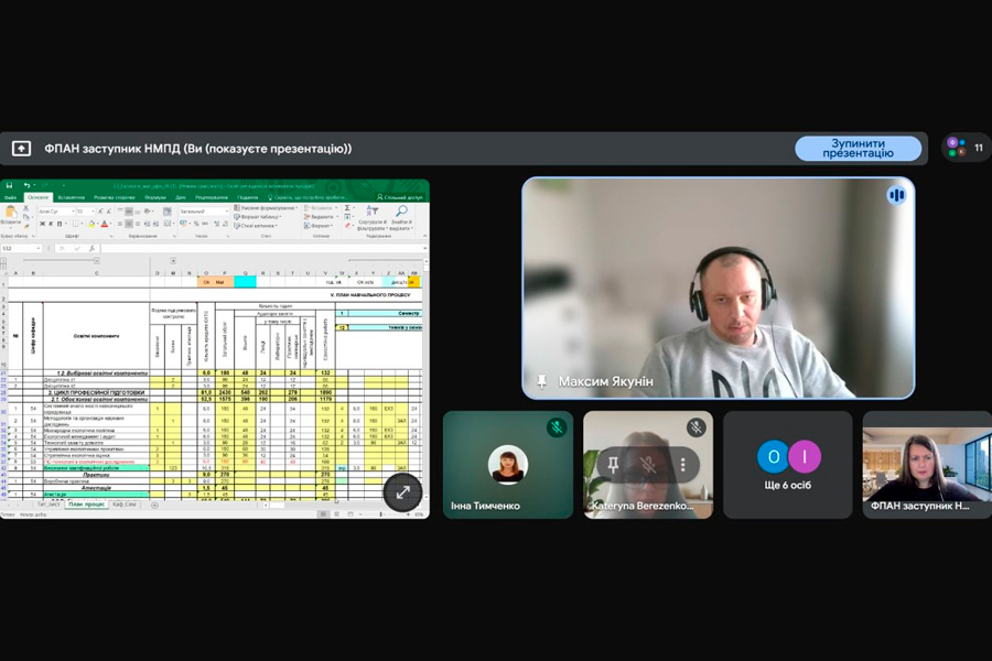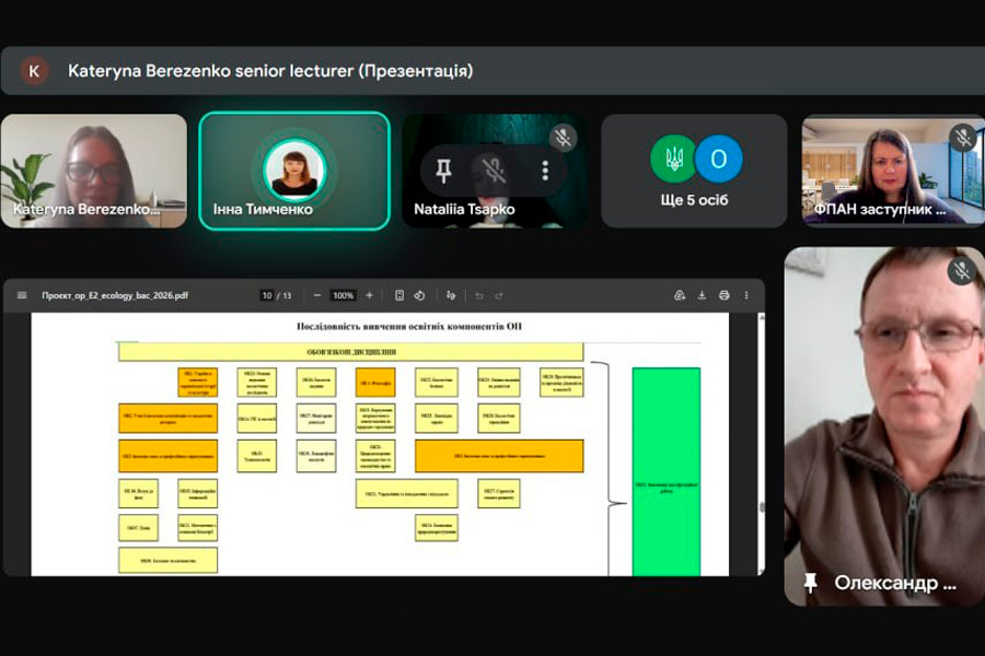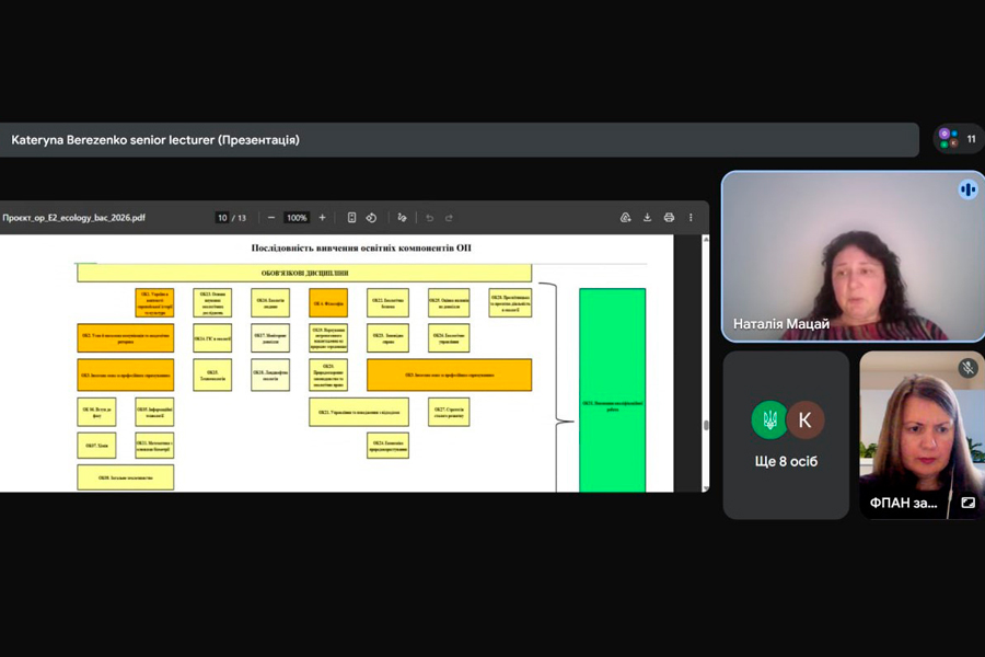 The head of the Department of Landscape Gardening and Ecology, Associate Professor I. S. Kravets, actively participated in the discussion of the educational programs; I.V. Tymchenko, member of the project group, associate professor of the Department of Landscape Gardening and Ecology; Berezenko K.S., member of the project group, senior lecturer of the Department of Landscape Gardening and Ecology; students Oleksii Sobyna and Kateryna Makarova. The participants of the meeting noted the relevance of educational programs, their compliance with modern challenges in the field of environmental protection and the practical orientation of students training.
