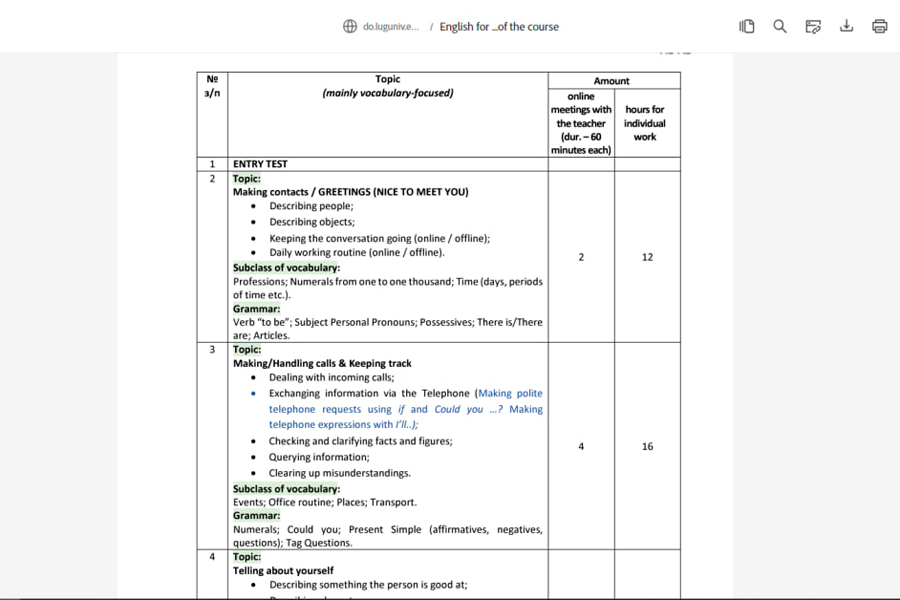 The participants of the event were presented with the teaching staff of the course, acquainted with its main tasks, such as: 1) to ensure the ability of the course students to communicate in English for professional purposes (level A1-A2, B1, Common European Framework of Reference, based on Cambridge University’s English-language course “Empower”); 2) to improve the ability to use authentic sources and assess the usefulness and relevance of information on English-language websites; 3) to develop the ability to carry out oral presentation, participate in discussions on professional issues in English; 4) to teach course participants to effectively use techniques and strategies for independent work on learning a foreign language. The project is planned for a 4 months period, of which: 1) 2 months of online work with a teacher in accordance with the approved program of the course; 2) 2 months – independent fulfillment of tasks and consulting support from teachers through e-mail and the course website on the Educational Portal of SI “Luhansk Taras Shevchenko National University” (http://do.luguniv.edu.ua/).