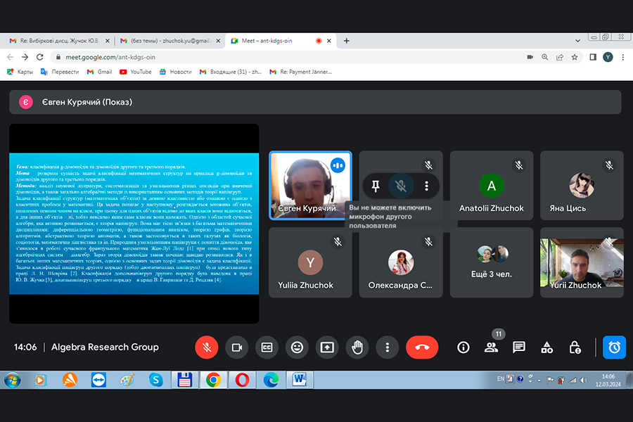At the beginning of March, the first research group - the Algebra Research Group (hereinafter ARG) - was established at Luhansk Taras Shevchenko National University. Recently, the first meeting of this research group was held, which was headed by Yurii Zhuchok, Doctor of Physical and Mathematical Sciences, Professor of the Department of Mathematics and Informatics. The ARG members included professors and associate professors of the Department of Mathematics and Informatics, postgraduate and master's students majoring in 111 Mathematics, and a student majoring in 014 "Secondary Education. Math".