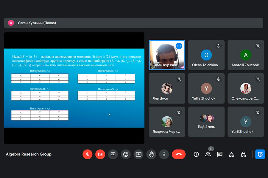As part of the first meeting of the ARG, the results of a student's scientific work in mathematics of a 3rd-year student majoring in 014 "Secondary Education. Mathematics" were considered by Yevhen Kuriachii on the topic: "Classification of g-demonoids of the second and third orders" (scientific supervisor - Ph.D., Professor Yurii Zhuchok). The work received positive reviews and was recommended for participation in scientific competitions of the All-Ukrainian level. Anatolii Zhuchok, Doctor of Physical and Mathematical Sciences, Professor, Vice-Rector of Luhansk Taras Shevchenko National University and Olena Toichkina, Candidate of Physical and Mathematical Sciences, Associate Professor of the Department of Mathematics and Informatics, gave useful advice to the speaker regarding further research.
