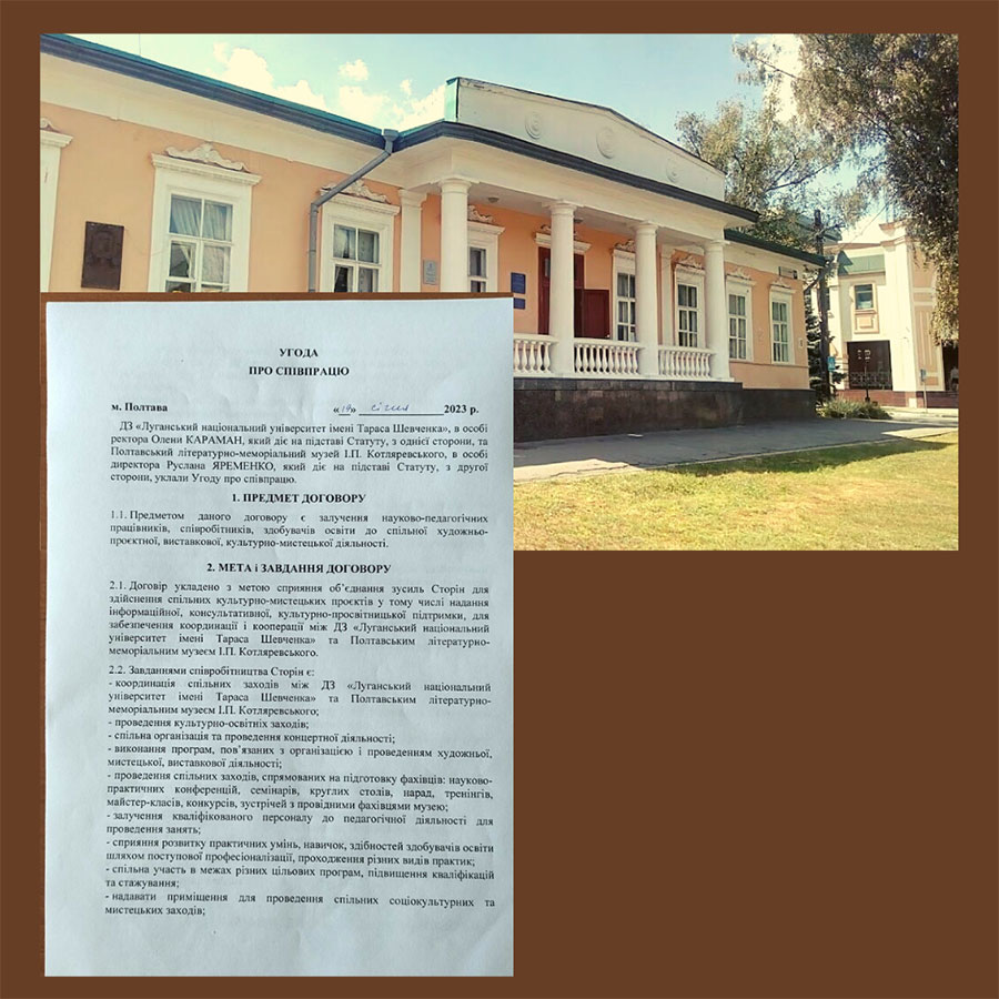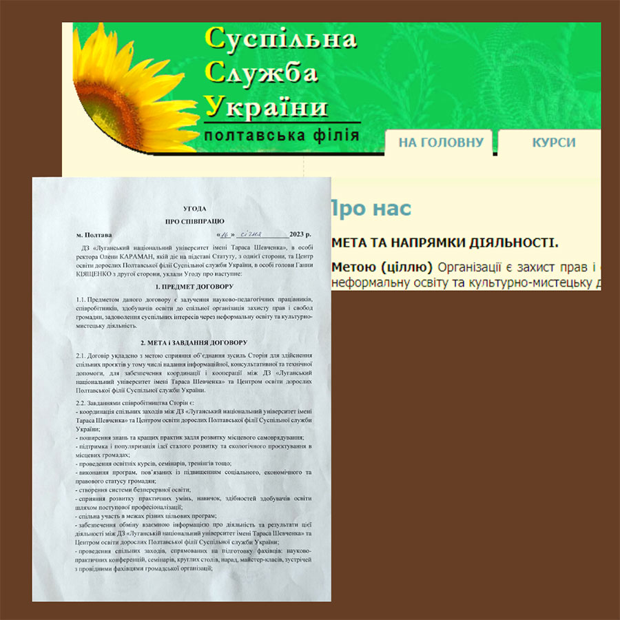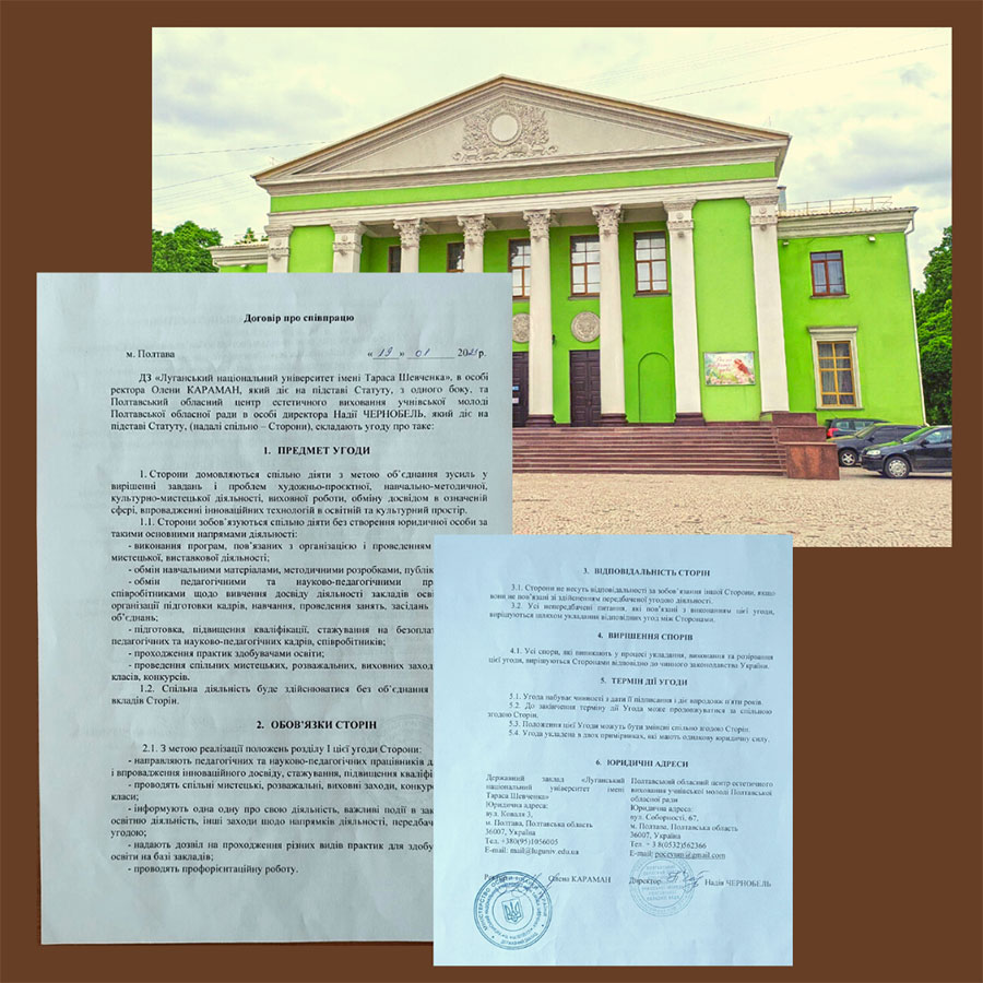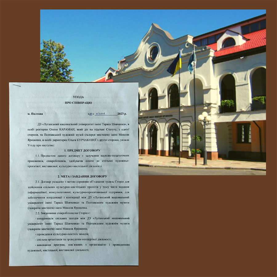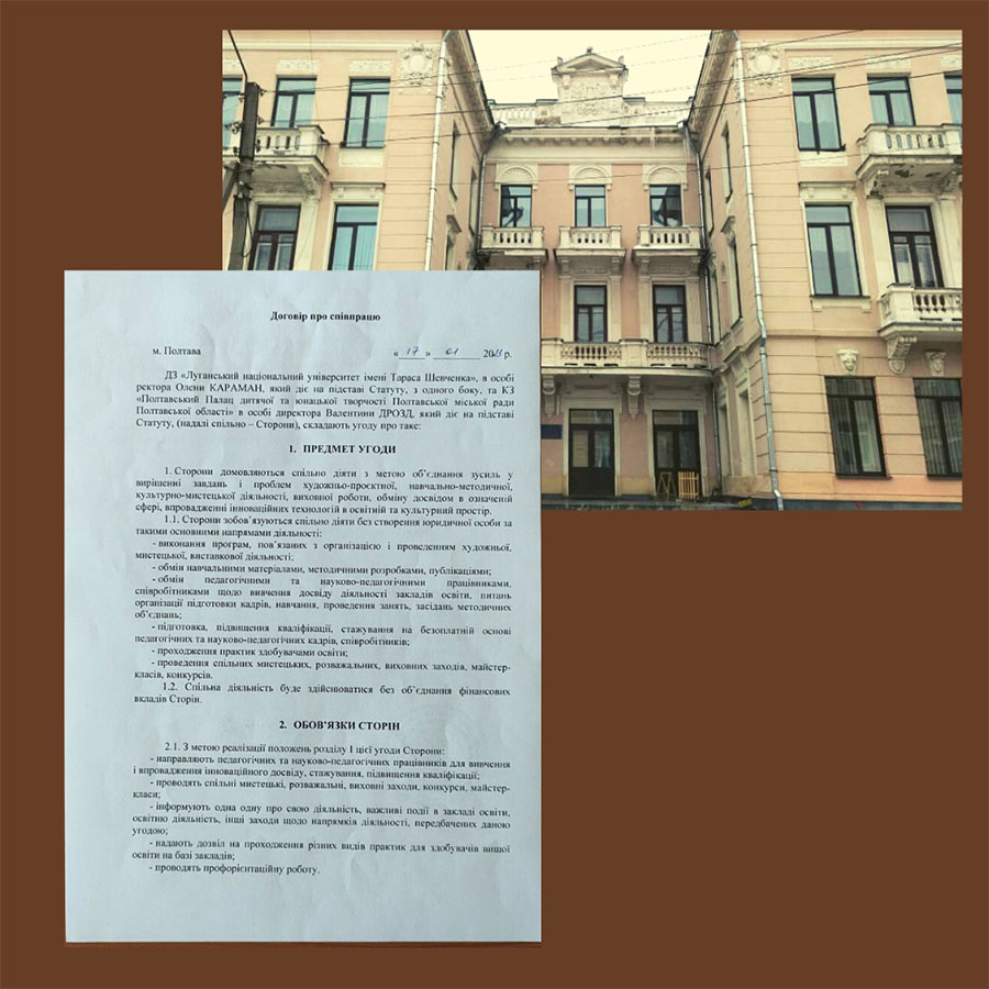 On January 17, 2023, a cooperation agreement was signed between Luhansk Taras Shevchenko National University and the Center for Culture and Leisure of the Poltava City Territorial Community and the Poltava Palace of Children and Youth Creativity of the Poltava City Council of the Poltava Region, and on January 19, with the Poltava Regional Center for Aesthetic Education of Pupils of the Poltava Regional Council. The parties agreed to act jointly in solving the problems of artistic-project, educational-methodical, cultural-artistic activities, educational work, exchange of experience in the specified field, implementation of innovative technologies and educational and cultural space.