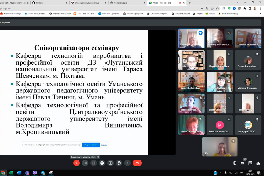 On April 20-21, 2023, the Department of Production Technologies and Professional Education of Luhansk Taras Shevchenko National University, together with the Department of Technological Education of the Pavlo Uman Tychyna State Pedagogical University, Uman and the Department of Technological and Professional Education of the Volodymyr Vynnychenko Central Ukrainian State University, Kropyvnytskyi organized an interdepartmental seminar "Problems of Technological Education".