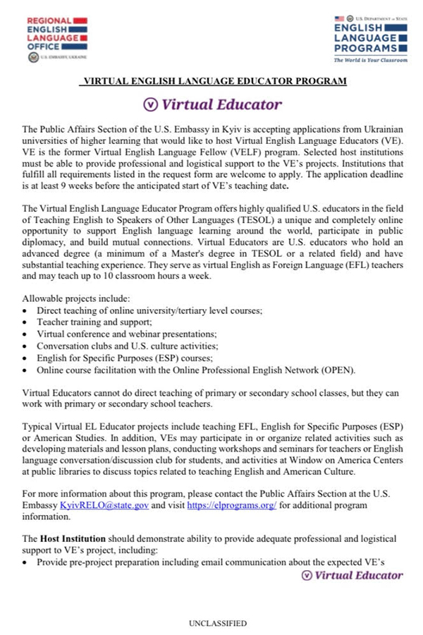 Note that the Faculty of Foreign Languages of Luhansk Taras Shevchenko National University of Ukraine has a long and successful history of cooperation with the US Embassy in Ukraine, which partly dates back to the organization and holding the 8th American Studies Summer Institute American Identity: Regionalism and Nationhood and continuing to support the activities of the information and cultural center "Window on America", Starobilsk, during 2015-2022. The implementation of the Virtual English Language Educator program on the basis of the Faculty of Foreign Languages of Luhansk Taras Shevchenko National University will be the next step in effective cooperation between the two institutions.