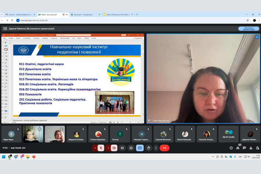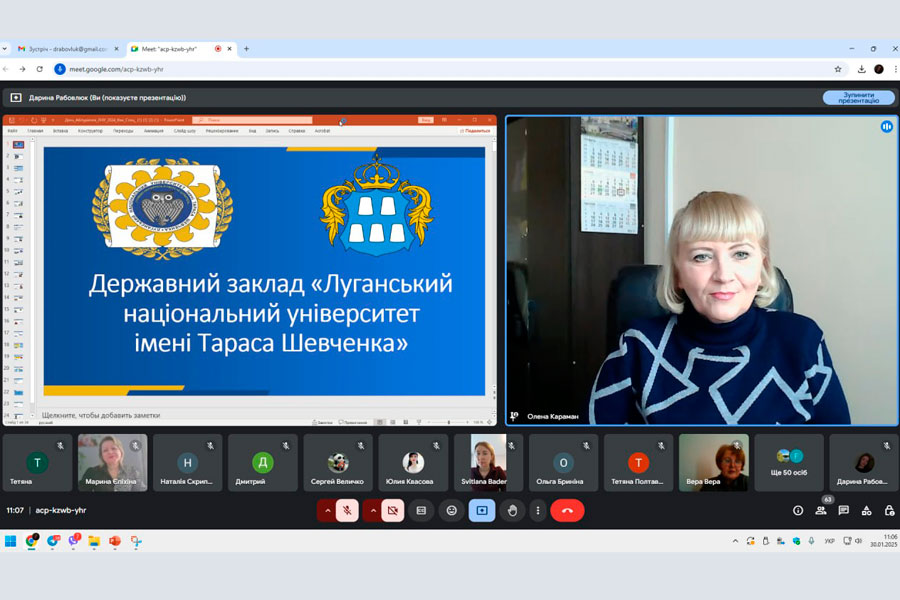 The online meeting was attended by the Rector of the University, Doctor of Pedagogical Sciences, Professor Olena Karaman; Vice-Rector for Scientific and Pedagogical Work, Doctor of Pedagogical Sciences, Professor Yaroslava Yurkiv; Director of the ER IPP, Deputy Directors, Heads of Departments, Graduates and Teachers of the Luhansk Region. A total of 65 people attended the event. The meeting was opened by the rector of the institution, who spoke about the glorious 103-year history of the university - a large and powerful educational, scientific and industrial complex, the structure of which includes 10 educational and scientific institutes, 6 professional colleges, the Regional Center for Professional Education, which train specialists at all educational levels and academic degrees.