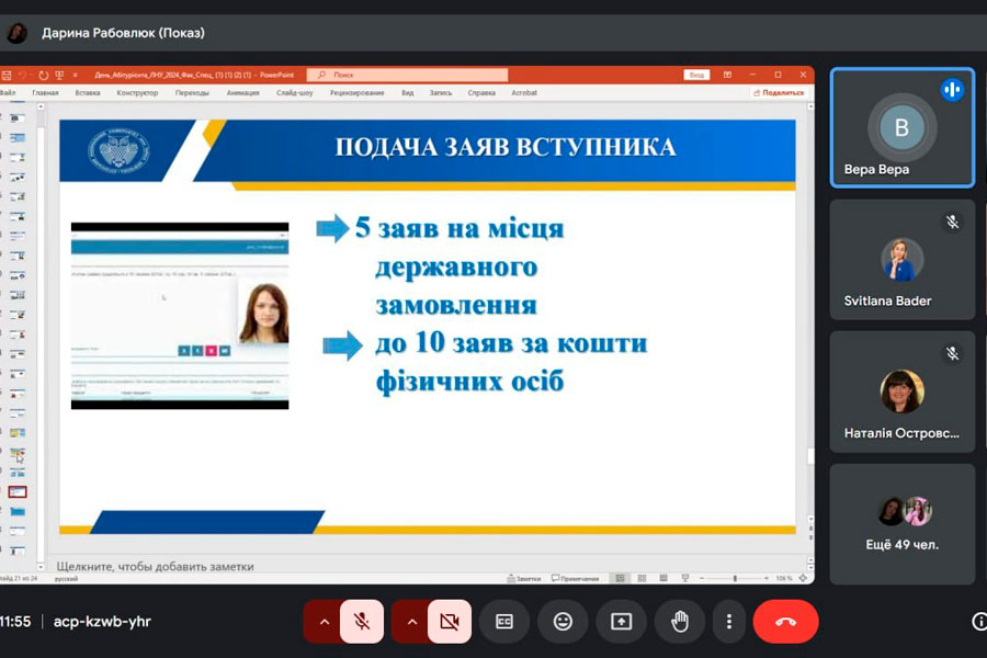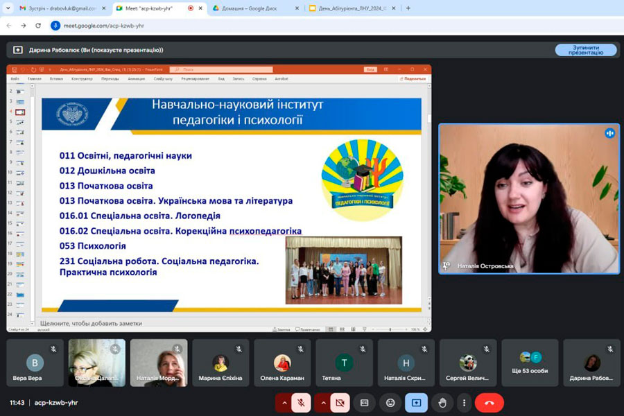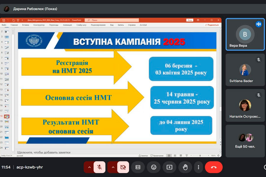 The moderator presented all specialties of structural units (institutes and colleges), emphasized the advantages of studying at Luhansk Taras Shevchenko National University. The attention was drawn to the 12 main steps for entering the university, the students were acquainted with the calendar plan for organizing and conducting the national multi-subject test (NMS) and the features of the admission campaign - 2025.