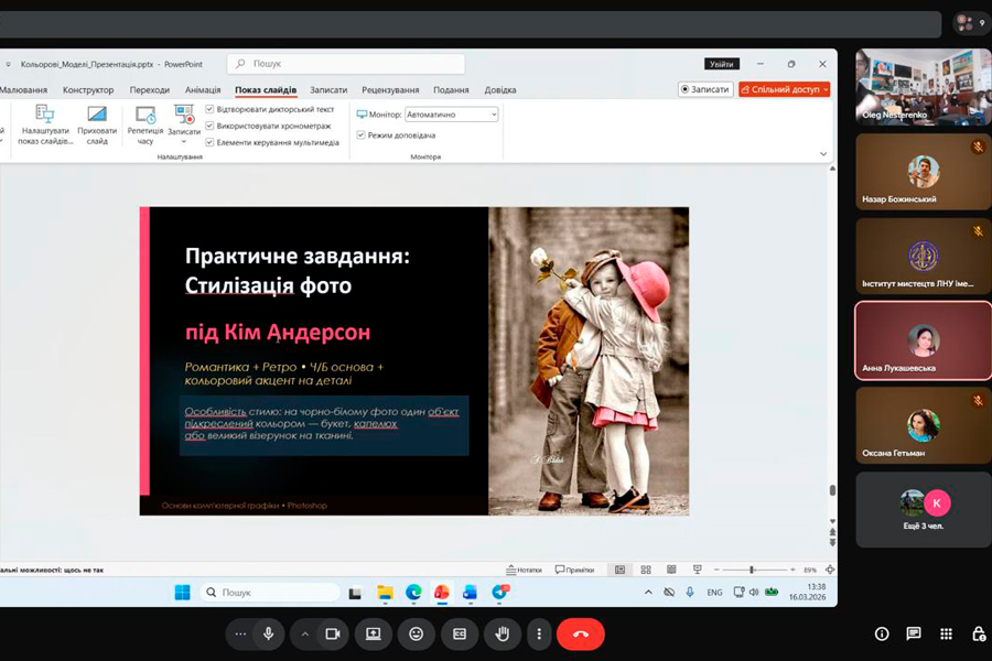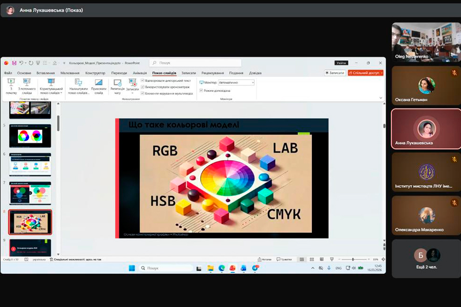 The series continued with an online lecture by Anna Lukashevska on the topic: “Color models: RGB, CMYK, HSB, LAB. Color palette and color correction”. The lecture examined in detail the technical aspects of working with color in design. The speaker explained the differences between the main color models, the features of their application in different environments and demonstrated practical approaches to creating a harmonious color palette and performing color correction.