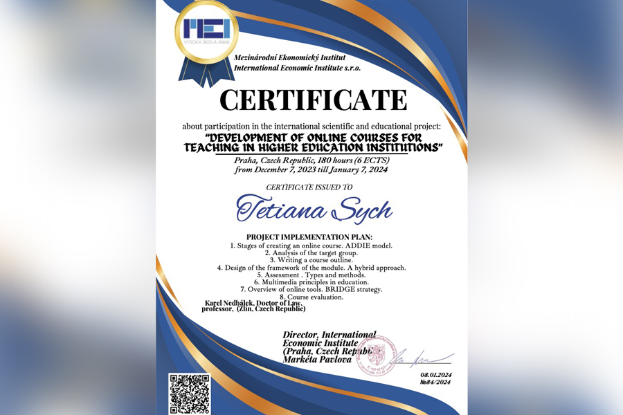 In January 2023, the Professor of the Department of Public Service and Management of Educational Institutions, Tetiana Sych, took part in the International Scientific and Educational Project "Development of Online Courses for Teaching in Higher Education Institutions".