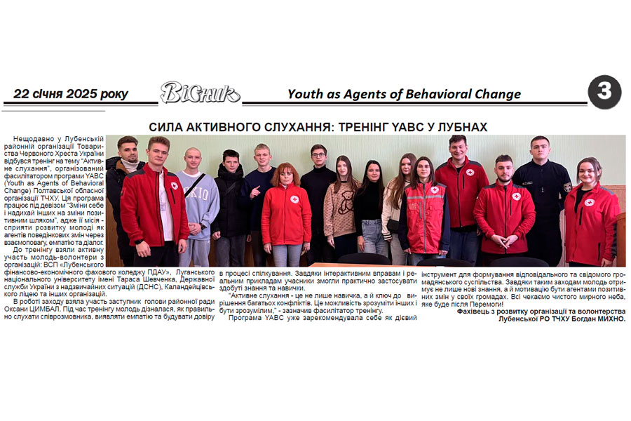 Vadym Demianchuk, a 4th-year student of the Educational and Research Institute of Physical Education and Sports, majoring in 227 “Therapy and Rehabilitation,” took part in a training organized by the facilitator of the Youth as Agents of Behavioral Change program of the Poltava Regional Organization of the Youth as Agents of Behavioral Change, which operates under the motto “Change yourself and inspire others to change in a positive way.”