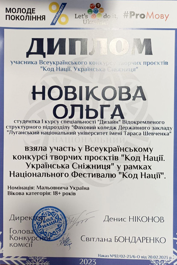 During December 2022 - February 2023, Olha participated in the All-Ukrainian competition of creative projects "Code of the Nation. Ukrainian Snizhnytsia" as part of the National Code of the Nation festival, where she received a diploma as a participant in the competition in the "Picturesque Ukraine" category.