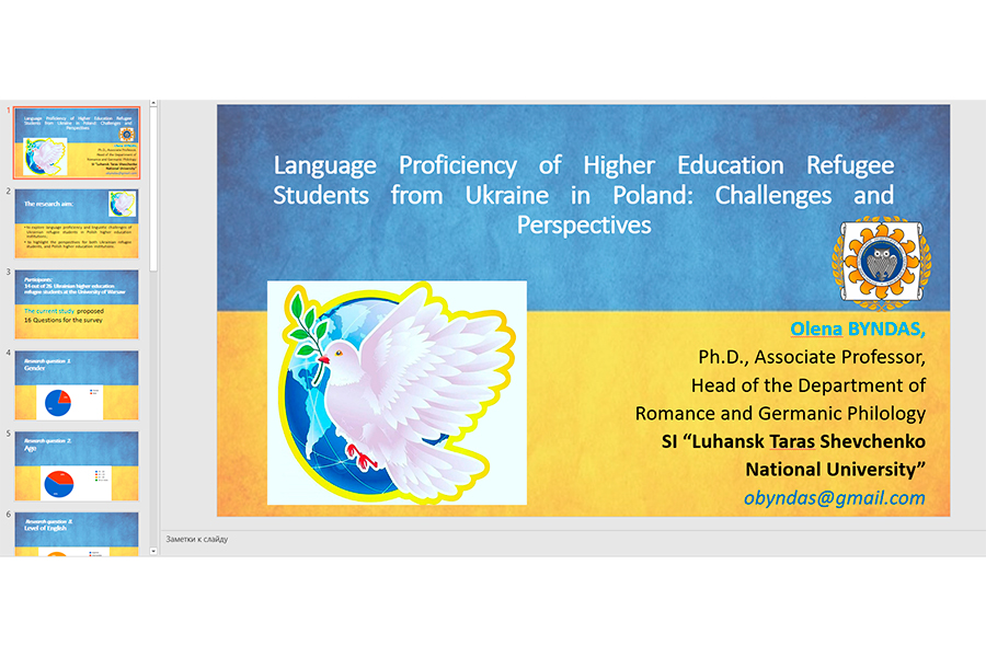 The Head of the Department of Romance and Germanic Philology, Candidate of Pedagogical Sciences, Associate Professor Olena Bindas spoke at the plenary session with a report "Language Proficiency of Higher Education Refugee Students from Ukraine in Poland: Challenges and Perspectives").
