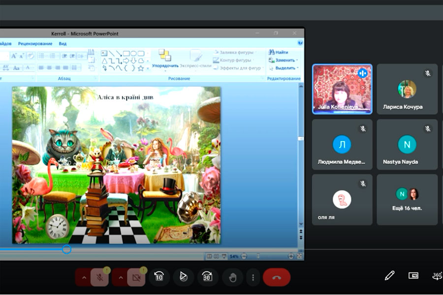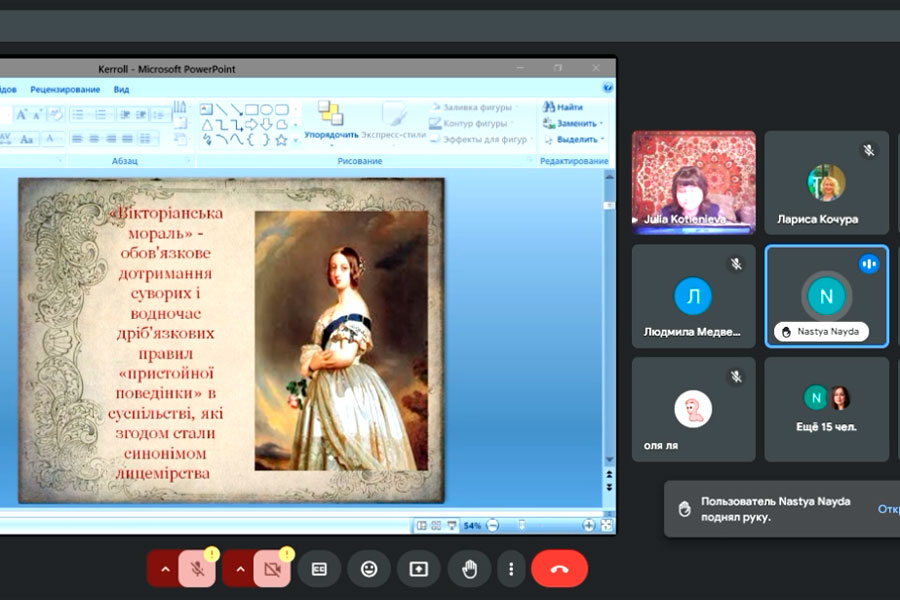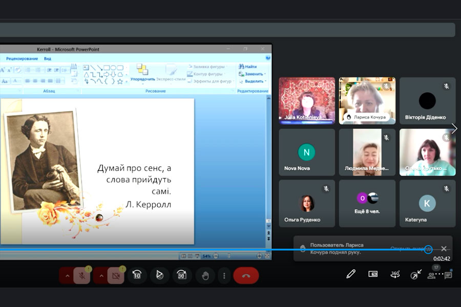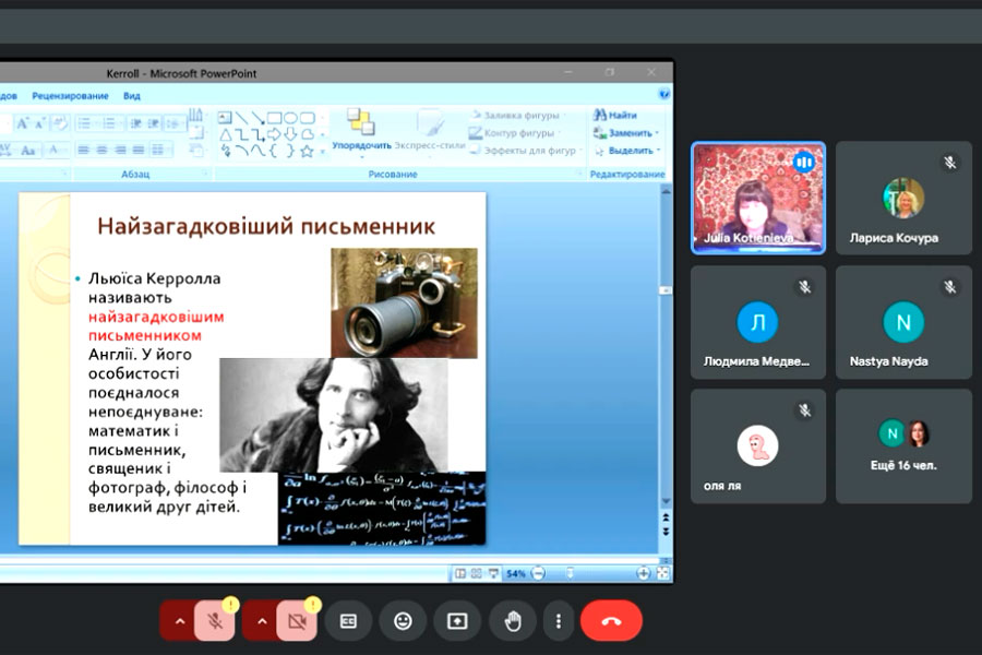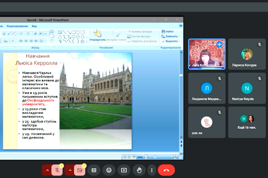 During the lecture, the lecturer spoke about the creative history of writing Lewis Carroll's fairy tale "Alice in Wonderland", which arose under the influence of real events and real people; characterized the features of the artistic language of the work, giving examples of puns, phraseological units, figurative verse in both Ukrainian and English.