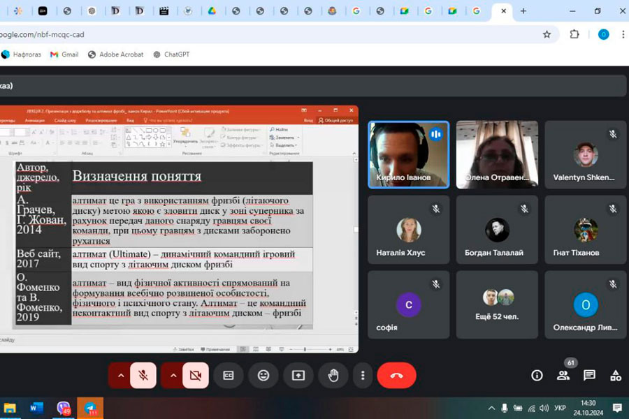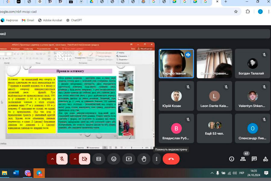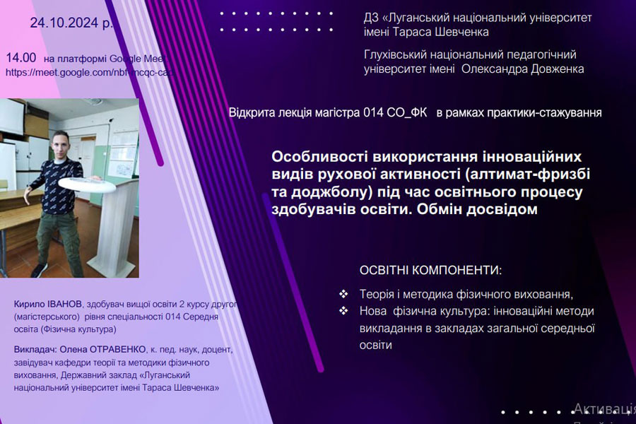 As part of internship practice and academic mobility, an open online lecture was held on October 24, 2024 at 2:00 p.m. on the topic: "Features of using innovative types of motor activity (ultimate frisbee and dodgeball) during the educational process of students. Exchange of experience" under the program of the New Ukrainian School.