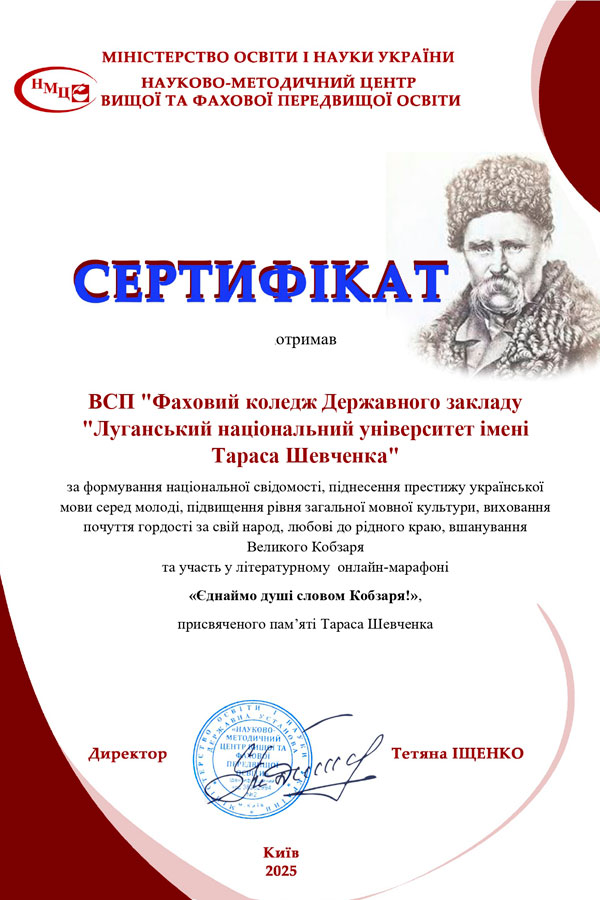 From March 4 to 7, 2025, students of the Professional College participated, reciting the works of T. Shevchenko, in the All-Ukrainian literary online marathon “Let's unite souls with the word of the Kobzar!” on the social network Facebook, which was held by the Scientific and Methodological Center of the VFPO.
