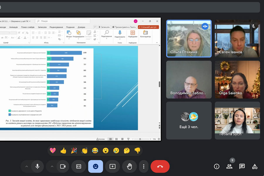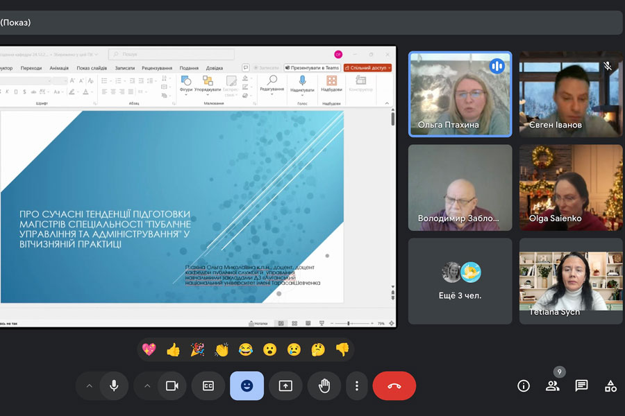 The meeting considered important issues regarding admission to the final certification of master's students majoring in "Management", educational program Management of Educational Institutions; Associate Professor Olha PTAKHINA acquainted those present with modern trends in the training of master's students majoring in "Public Management and Administration" in domestic practice; Associate Professor Olha SAIENKO presented the results of the analysis of the labor market of the regions of Ukraine regarding students majoring in "Public Management and Administration".