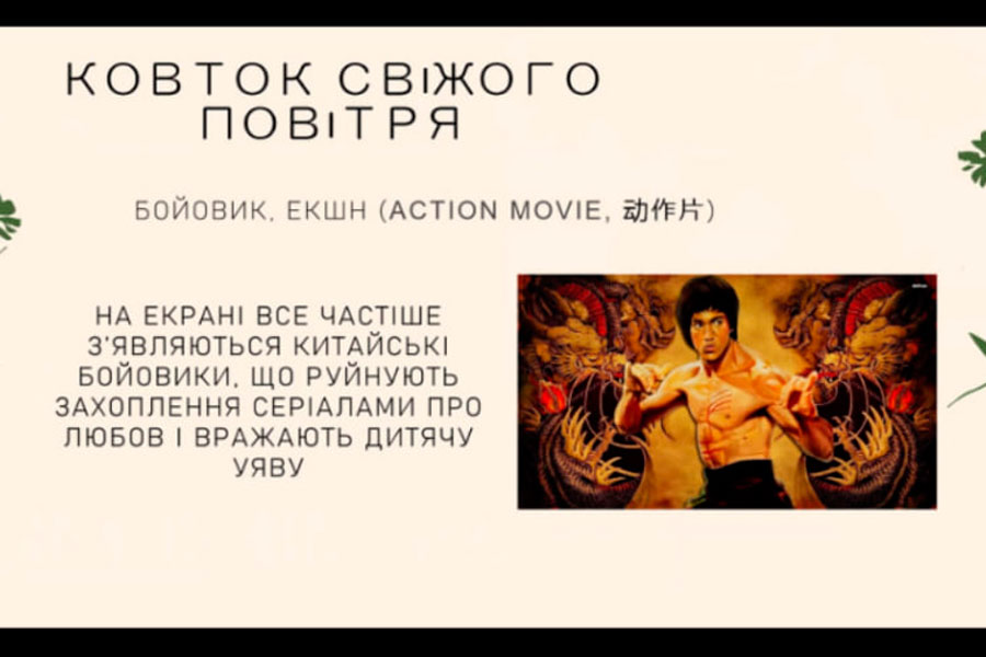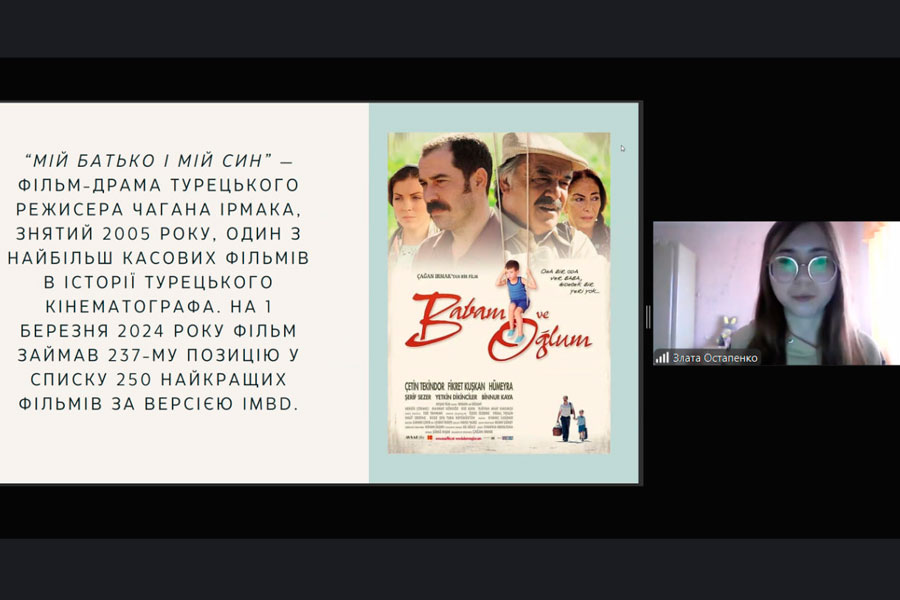 First-year student Zlata Ostapenko spoke about Turkish cinema and the film «My Father and My Son», which addresses themes of family relationships and social change. Second-year student Ivan Zodorozhniy presented the iconic Chinese film «Hero» by director Zhang Yimou, uncovering its artistic features and cultural context.