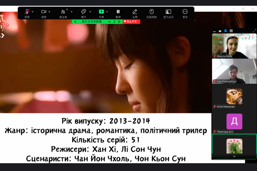 Second-year student Sofiya Nedohybchenko introduced the audience to popular Korean dramas, particularly the series «Empress Ki». Associate Professor Yuliya Malakhova revealed the distinctive features of Japanese anime, emphasizing the genre's significance in global culture. She explained in detail how anime reflects Japanese traditions, philosophy, and social phenomena, and also drew attention to key stages in the development of animation cinema in Japan. As an example, Yuliya Volodymyrivna presented the anime «Suzume», which, according to her, is an excellent example of the quality and emotional depth of modern Japanese anime.