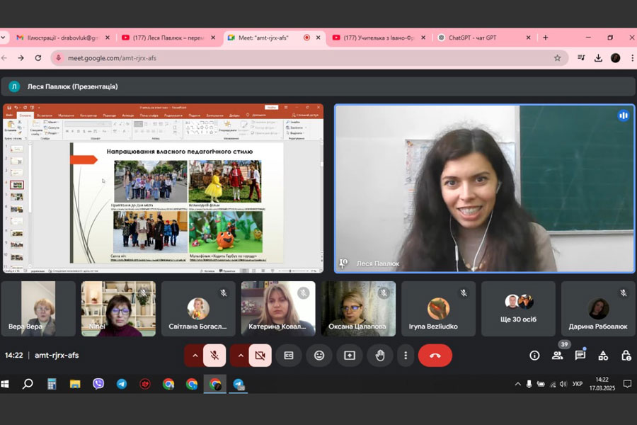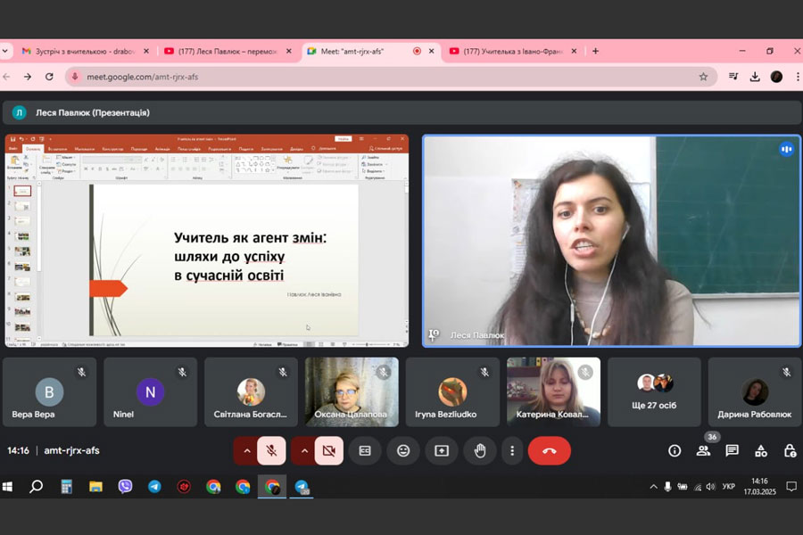 On 17.03.25, at the Educational and Research Institute of Pedagogy and Psychology of LTSNU, at the initiative of the Primary Education Department, an online meeting was held with Lesia Ivanivna Pavliuk, the winner of the Global Teacher Prize Ukraine 2024 national award, a primary school teacher at Lyceum No. 7 in the city of Ivano-Frankivsk.