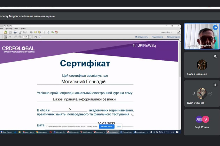 З цього приводу 23 березня 2023 року директор навчально-наукового інституту фізики, математики та інформаційних технологій, Могильний Геннадій Анатолійович, кандидат технічних наук, доцент провів консультаційну зустріч зі здобувачами освіти навчально-наукового інституту економіки та бізнесу. Він розповів, що в межах підписаної грантової угоди G-202301-69860 між ЛНУ імені Тараса Шевченко та Civilian Research and Development Foundation of the USA (CRDF Global – Фонд цивільних досліджень та розвитку США) всім бажаючим надається можливість пройти безкоштовний онлайн курс з кібергігієни.