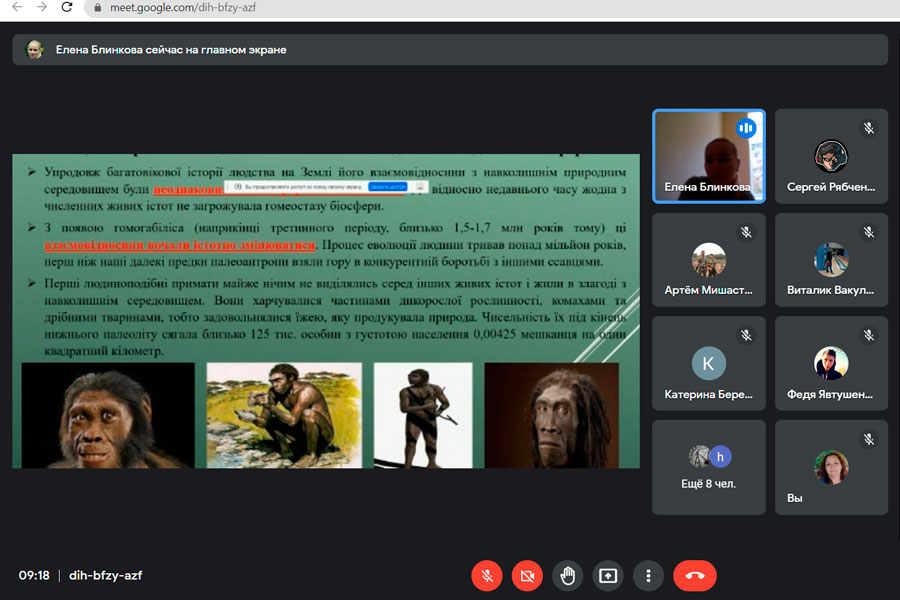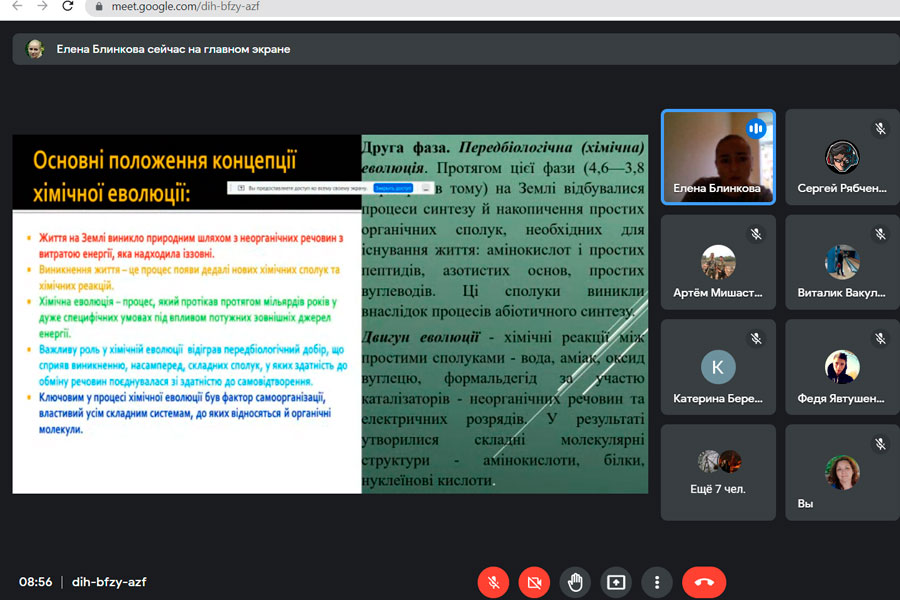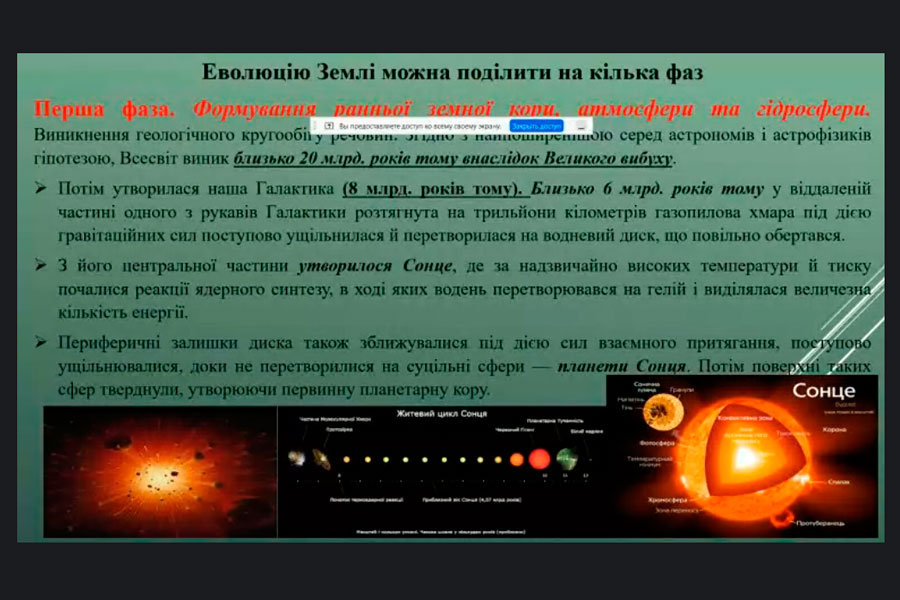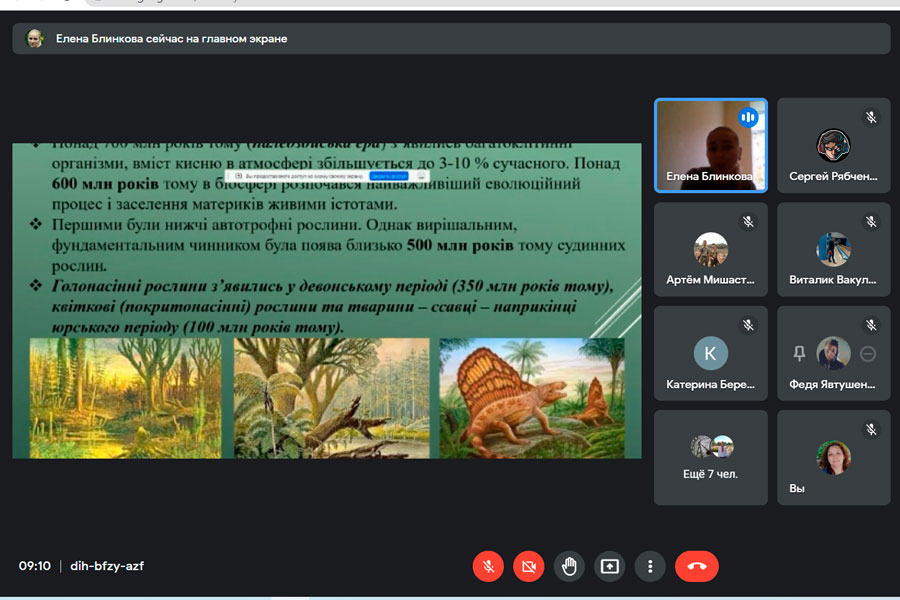 Під час семінару було розглянуто питання щодо етапи формування галактики, фази еволюції, процеси утворення сонця та його життєвий цикл, формування гідросфери та гіпотез виникнення життя на планеті. Під час зустрічі пані Олена розповіла про наукові експерименти пов’язані з хімічною теорією еволюції «первинний бульйон», біологічну еволоюці, періоди появи різих видів живих організмів та процеси заселення Землі. Було акцентовано увагу на висветлинні питаннь щодо дії факторів які впливали на процеси появи та зникнення живих організмів на нашій планеті. Наприкінці семінару Олена Ігоревна розповіла про особливості еволюцію людини, взаємовідносини між людиною та довкіллям та впливом людини на довкіллля задля задоволення власних потреб.