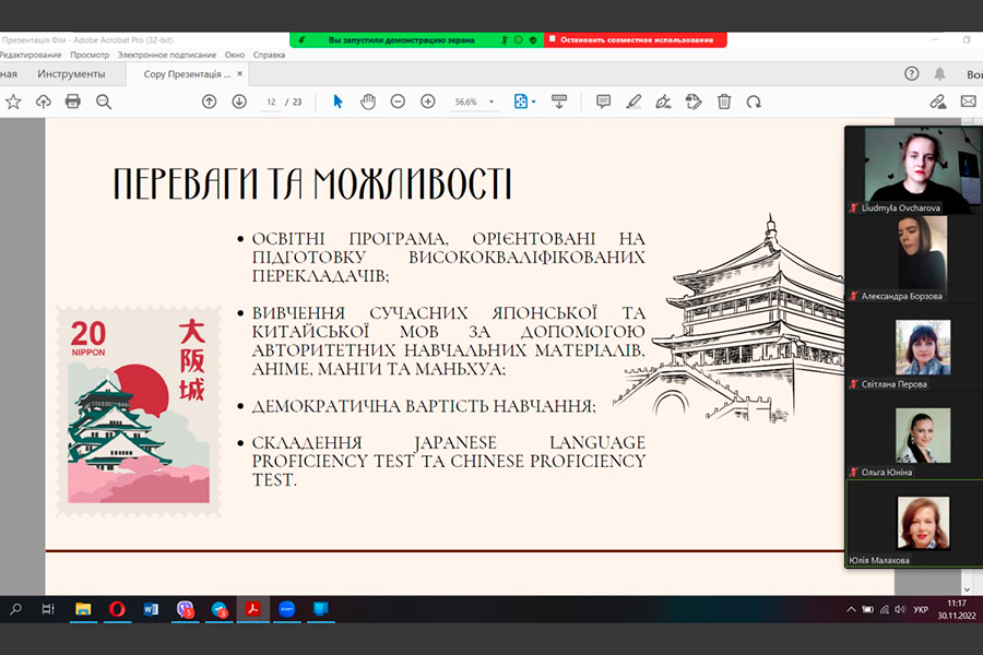 Захід було організовано та проведено в двох форматах - онлайн (для школярів м. Полтава, Полтавської та Донецької областей) на платформі Zoom, а також офлайн – з фізичною присутністю представників факультету в м. Лубни Полтавської області, де наразі працює ректорат університету. На онлайн зустрічі зі сторони факультету були присутні в.о.декана факультету Ірина Мигович, заступник декана з навчальної роботи Людмила Овчарова, завідувачі кафедр та викладачі факультету. Школярі представляли такі заклади: Полтавська загальноосвітня школа №11, Полтавська гімназія №13, Полтавська загальноосвітня школа №22, Полтавська загальноосвітня школа №24, Полтавська гімназія №33, Новосанжарський ліцей, Краматорський заклад загальної середньої освіти № 22 з профільним навчанням імені Миколи Миколайовича Крупченка Краматорської міської ради Донецької області, Кременчуцька гімназія №2, Кременчуцький ліцей № 10 «Лінгвіст», Кременчуцька гімназія № 22, Кременчуцький ліцей № 5 імені Т.Г.Шевченка. В процесі презентації освітньої пропозиції факультету іноземних мов в 2023 році учасникам було запропоновано заповнити онлайн-форму реєстрації. Загалом захід відвідало більше сорока осіб.