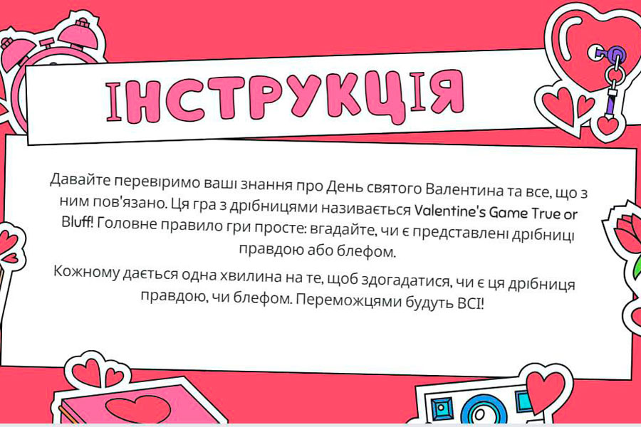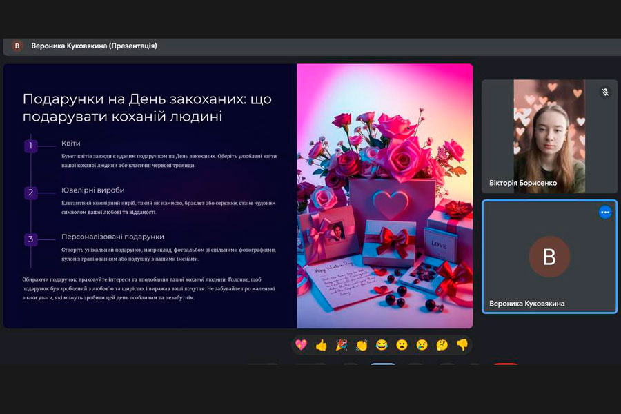 Надалі перейшли до цікавої гри Valentine’s Game True or Bruff, яку провела студентка 2 курсу спеціальності Економіка Вікторія Борисенко. Наприкінці зустрічі студенти подарували один одному віртуальні валентинки,чим забезпечили гарний настрій на цілий день.