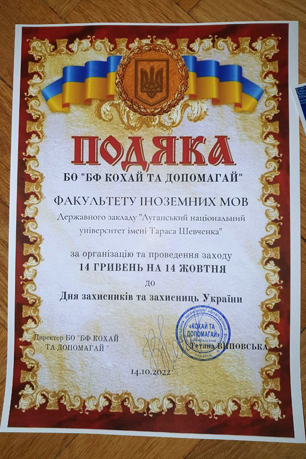 У жовтні здобувачі вищої освіти та співробітники факультету організували благодійну акцію по збору коштів на допомогу захисникам та захисницям України «14 гривень на 14 жовтня». Збір проходив через додаток Монобанка «Банка». В інтерактивній формі було сформовано 14 причин задонатити 14 гривень на ЗСУ. До збору могли залучитись всі охочі.