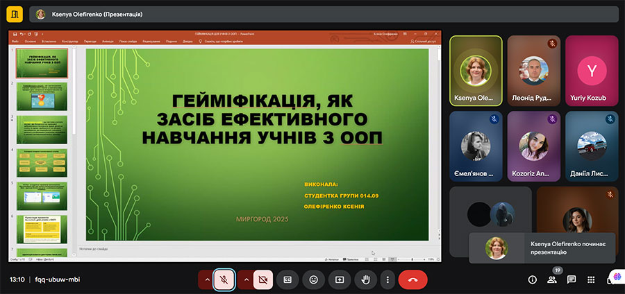 Олефіренко Ксенія Сергіївна, здобувачка освіти 1 курсу другого (магістерського) рівня вищої освіти, спеціальності СО (Інформатика), тема: «Гейміфікація, як засіб ефективного навчання учнів з особливими потребами», науковий керівник Козуб Г.О.;