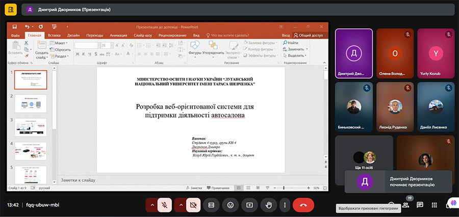 Дворніков Дмитро, здобувач освіти 4 курсу першого (бакалаврського) рівня вищої освіти, спеціальності Комп’ютерні науки, тема:«Розробка веборієнтованої системи для підтримки діяльності автосалона», науковий керівник Козуб Ю. Г.;