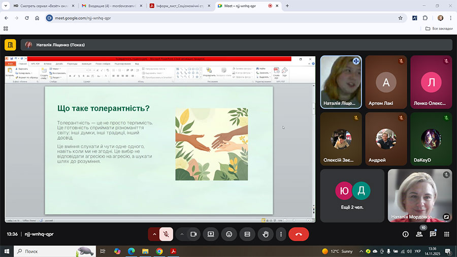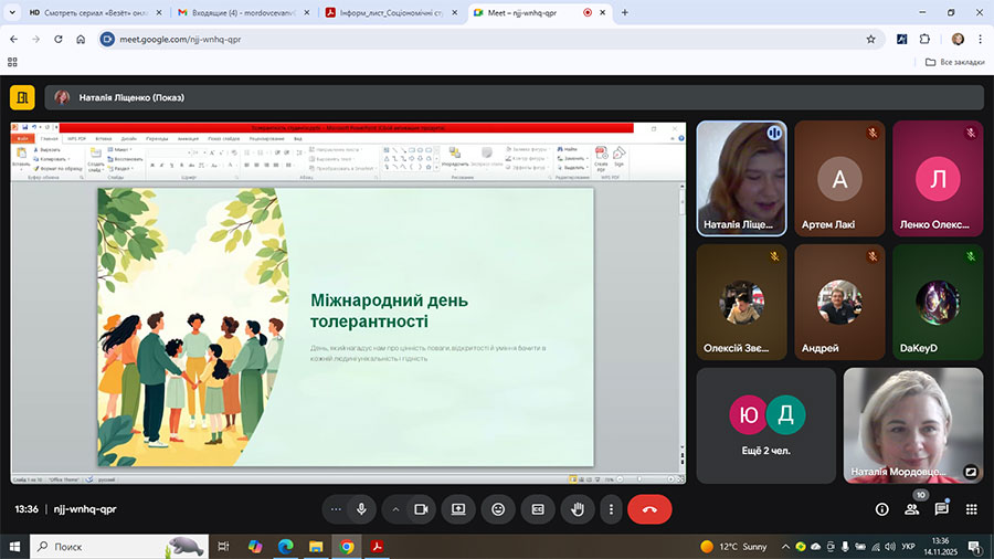 Напередодні Міжнародного дня толерантності завкафедрою початкової освіти Наталією Мордовцевою проведено едвайзерську годину. Під час зустрічі студенти розглянули різні аспекти поняття «толерантність» та її значення для професійної діяльності сучасного педагога. Учасники приділили увагу тому, як толерантність проявляється в освітньому середовищі, які виклики можуть виникати під час здійснення педагогічної діяльності, як формувати культуру взаємоповаги серед учнів початкової школи.