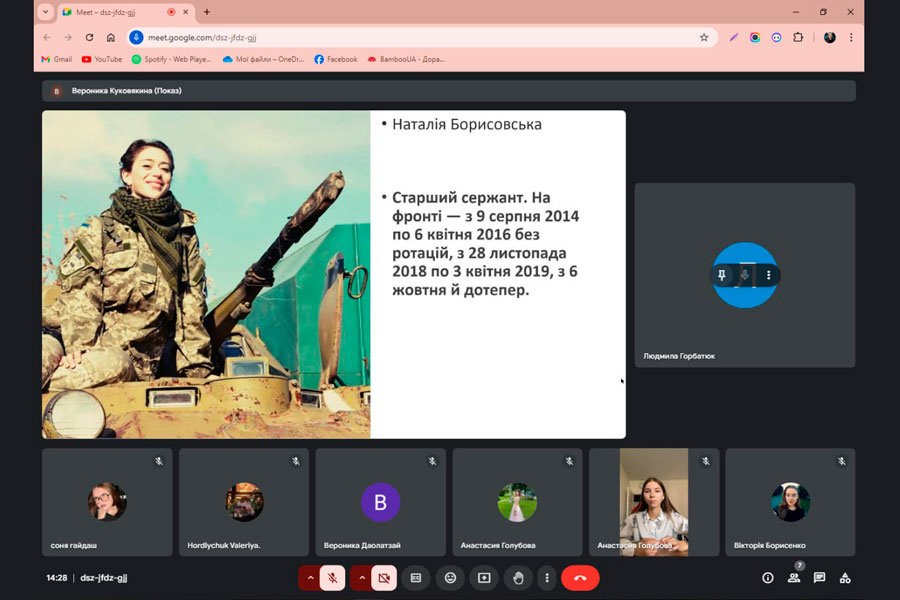 Вікторія БОРИСЕНКО, здобувачка вищої освіти 2 курсу освітньої програми Економіка за допомогою презентації розповіла про історію свята – Дня Захисників і Захисниць України, яке з минулого року відзначається 1 жовтня. Вікторія розповіла про свого земляка,, одного з найкращих пілотів повітряних сил ЗСУ, майстра повітряного бою - Оксанченка Олександра Яковича. Захисник України загинув 25 лютого 2022 року у повітряному бою над Києвом, відволікаючи на себе ворожу авіацію, був нагороджений посмертно званням Героя України.