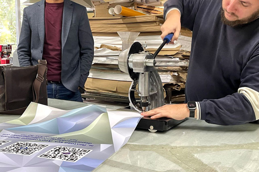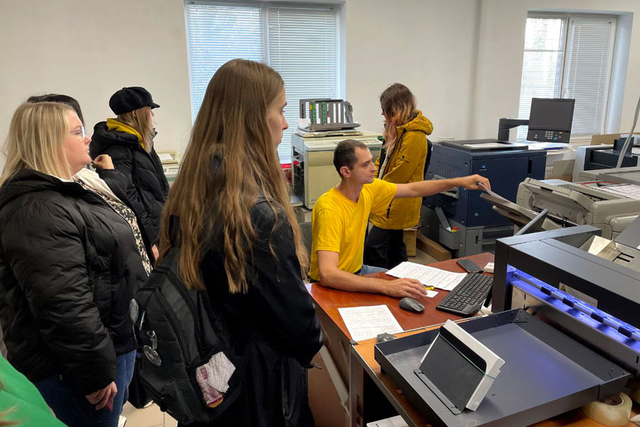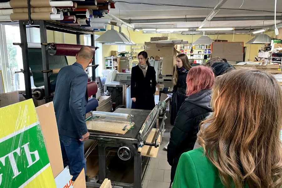 Екскурсія тривала дві години. Спочатку ми побували в офісі, де менеджери оформлюють закази, демонструють товари, обговорюють майбутній дизайн виробу. Далі було саме виробництво. Це двоповерхова будівля із безліччю типографських станків. Студентам спеціальності «Графічний дизайн» показали виробництво від маленьких наліпок до широкоформатного друку банерів, від виробництва службових посвідчень до лазерного друку на ялинкових прикрасах.